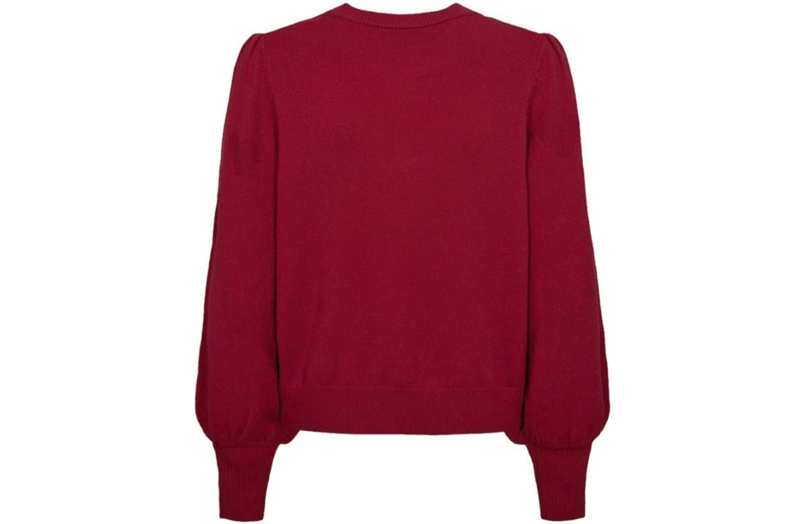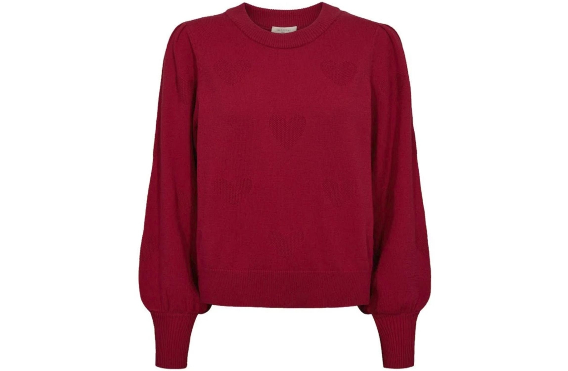 Freequent 206656 Alfa pullover. Dit rechtvallende model is voorzien van een ronde hals en heeft 3/4 mouwen. Deze rode pullover van Freequent is bewerkt met een hartjes motief. Dit model is afgewerkt met ribgebreide boorden.