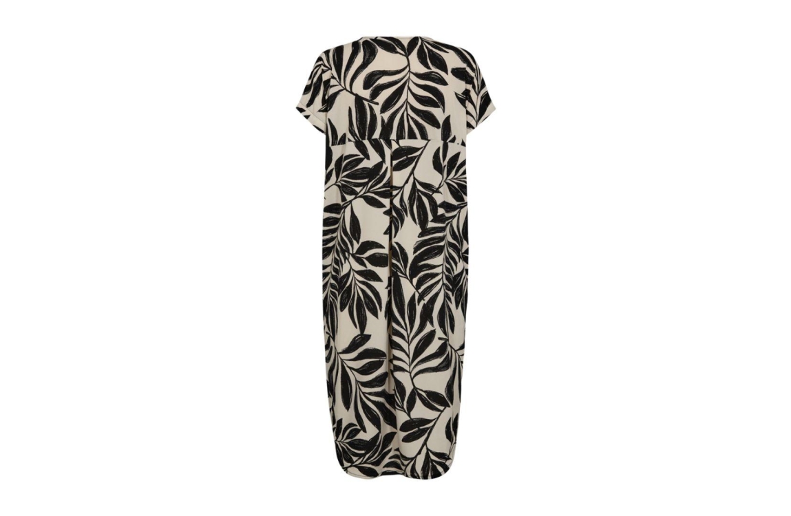 Freequent jurk FQFLOI 205985. Dit rechtvallend model is voorzien van een v-hals en heeft korte mouwen. Deze beige jurk beschikt over twee steekzakken en heeft een bloemenprint.