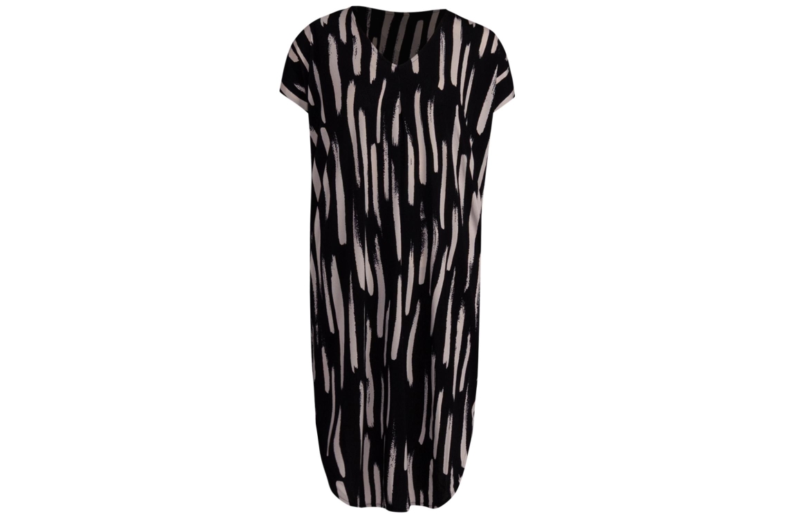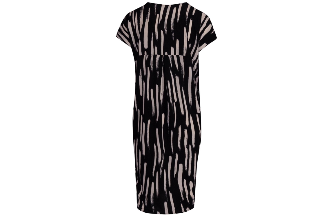 Freequent jurk FQFLOI 206676. Dit rechtvallend model is voorzien van een v-hals en heeft korte mouwen. Deze zwarte jurk beschikt over twee steekzakken en heeft beige penseelstreep patroon.
