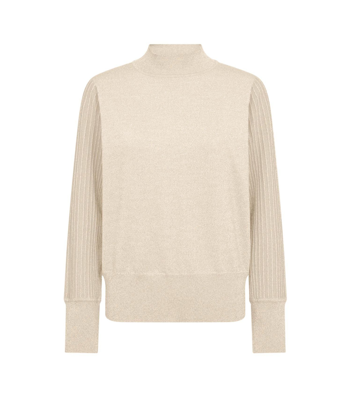 Freequent Metallic knit Moonbeam w. silver. Dit rechtvallende model is voorzien van een col en lange mouwen. Deze beige pullover van Freequent is gemaakt van een fijngebreide stof met een glanzende uitstraling en is op de mouwen bewerkt met ribdetails. Dit model is afgewerkt met brede ribboorden.