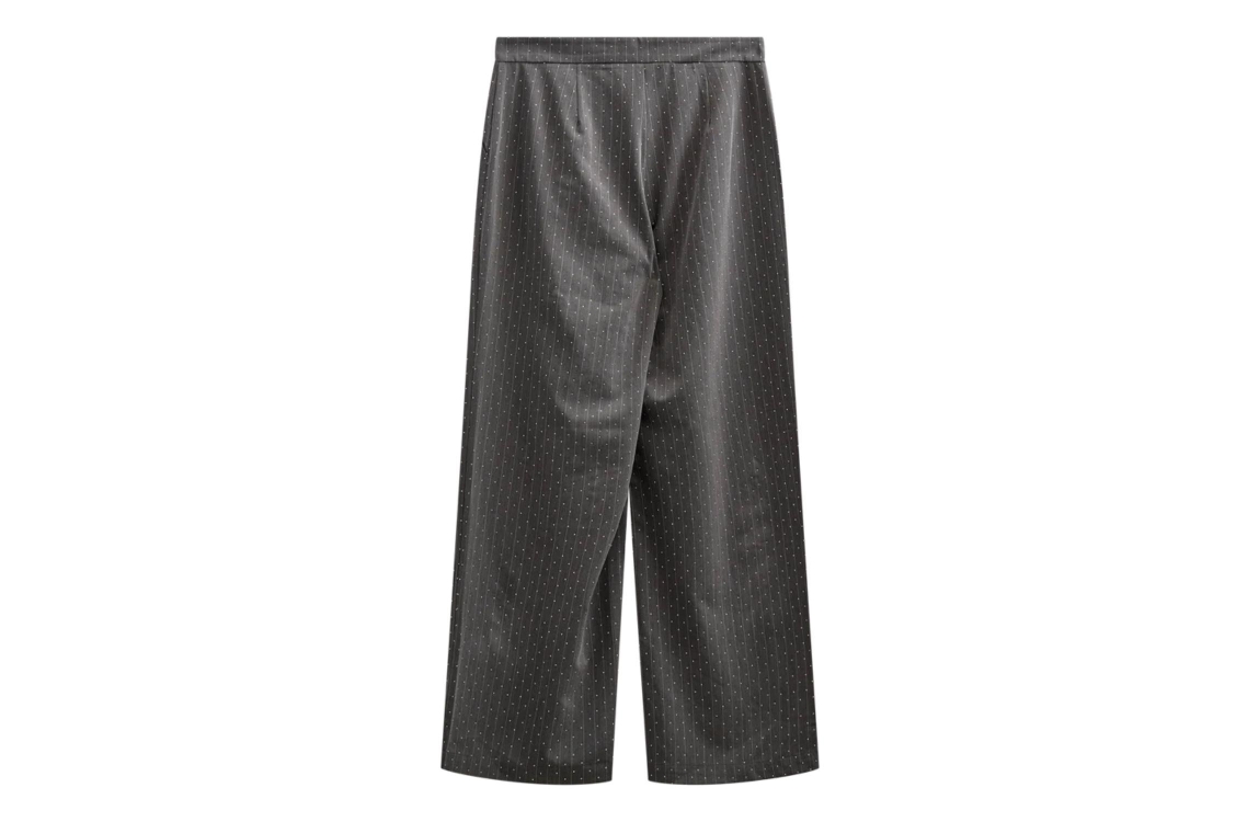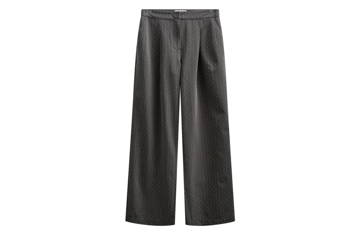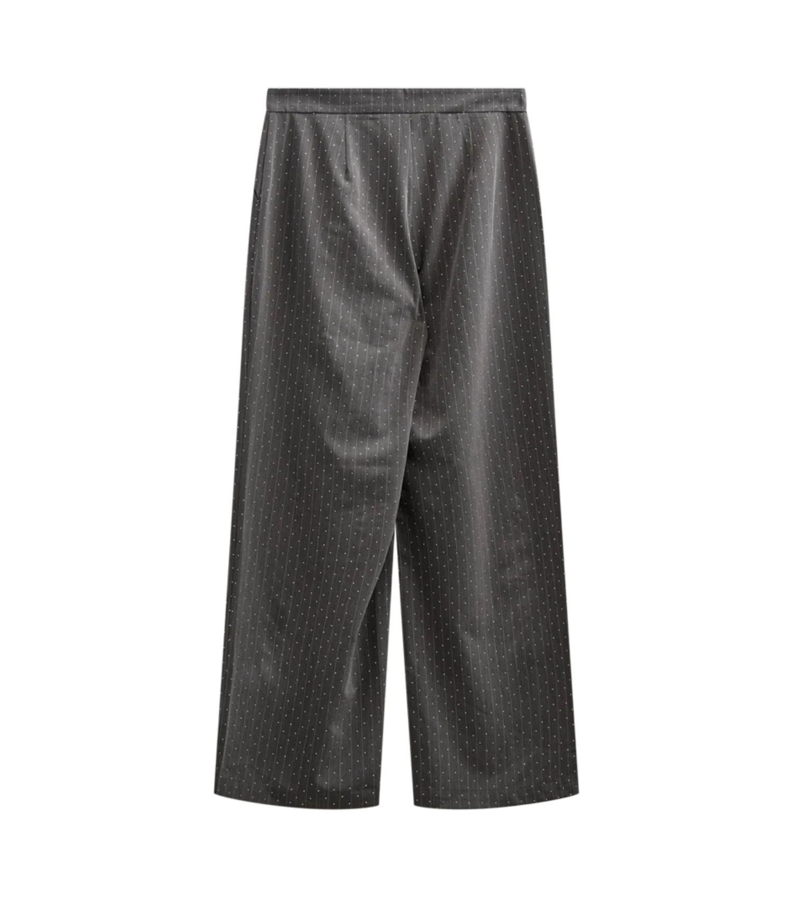 Freequent Pinstripe rhinestones 7427 Dark grey mel . star offwhite. Dit wijdvallende model sluit door middel van een knoop- en ritssluiting. Deze grijze broek van Freequent is all-over bewerkt met een krijtstreepprint en is all-over bewerkt met strass-steentjes. Het model is voorzien van twee steekzakken aan de voorzijde.