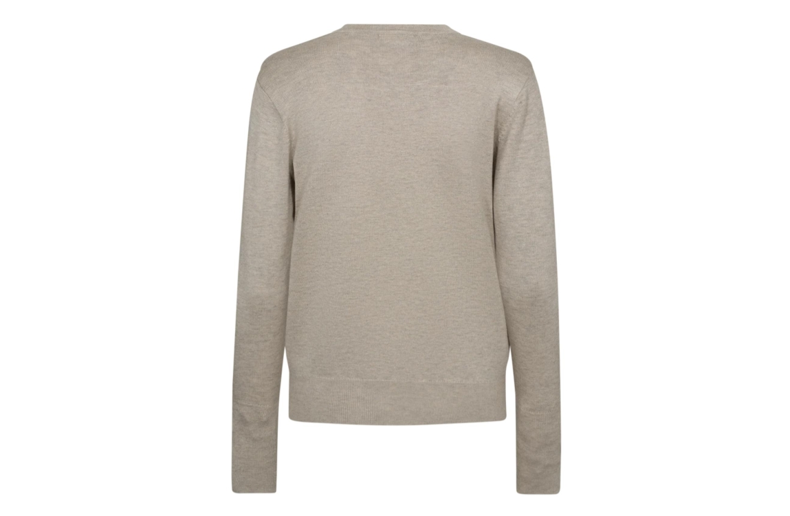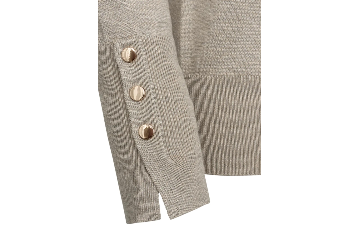 Freequent 203030 FQKATIE-PULLOVER. Dit rechtvallend model is voorzien van een ronde hals en heeft lange mouwen. Deze beige Freequent pullover is afgewerkt met sier knopen.