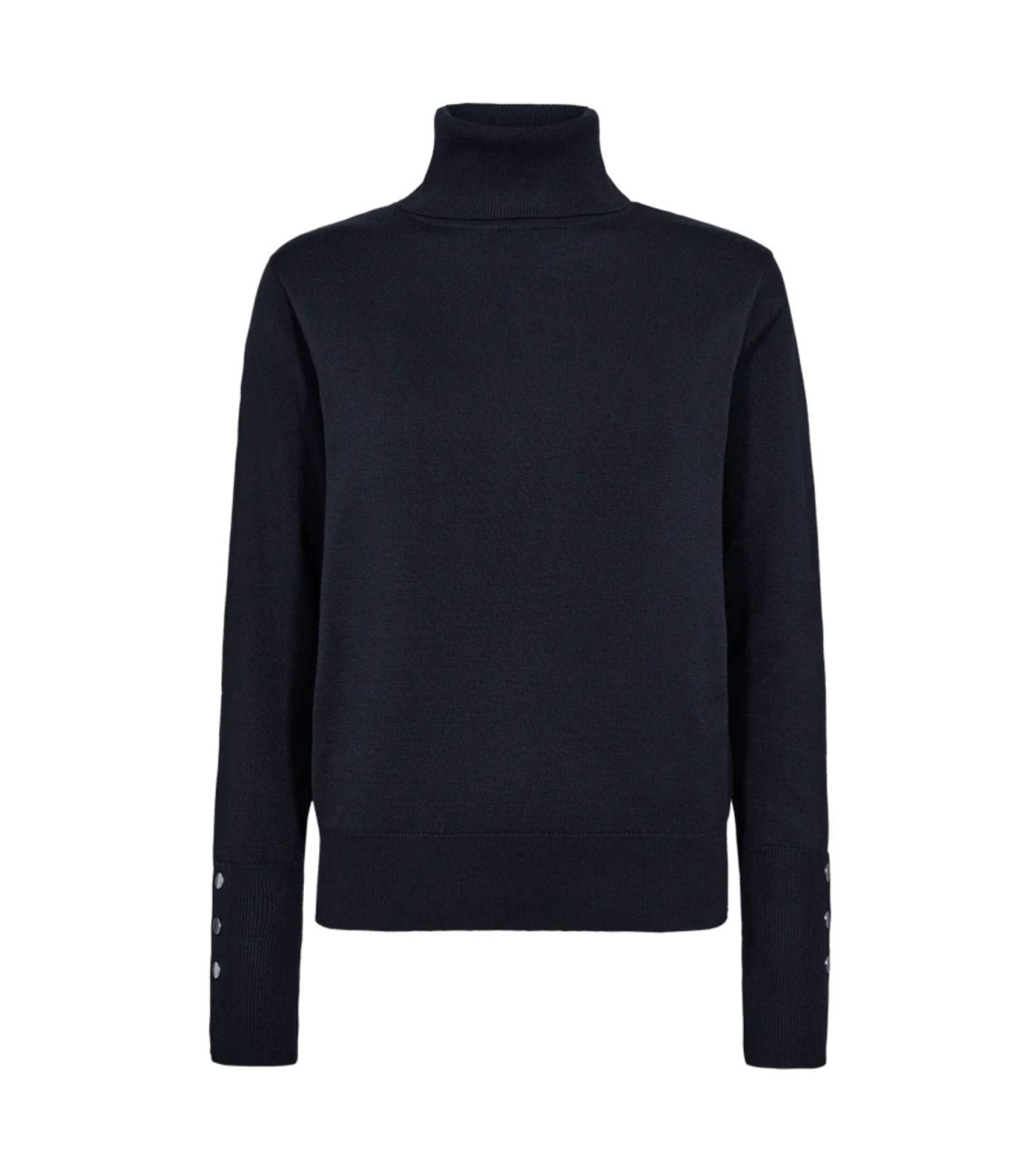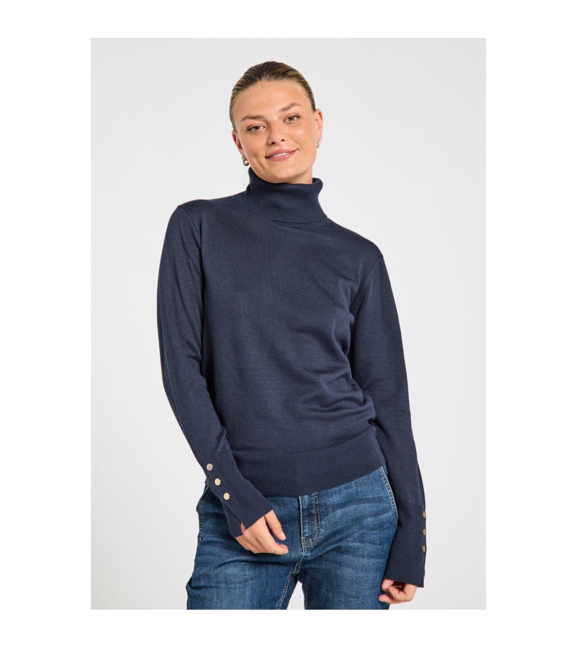 Freequent Plain flat gold button Salute. Dit rechtvallende model is voorzien van een col en heeft lange mouwen. Deze navy pullover van Freequent is bewerkt met sierlijke knopen onderaan de mouwen.