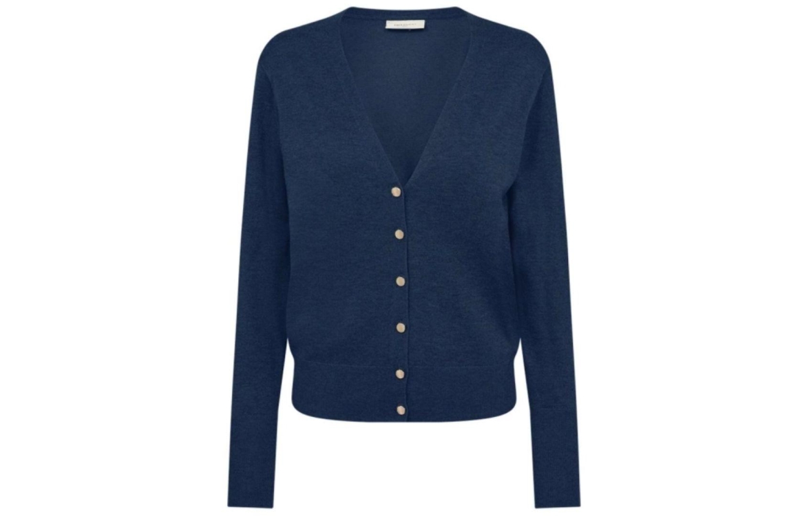 Freequent vest FQKatie 202763. Dit aangesloten model heeft een v-hals, lange mouwen en sluit door middel van gouden knopen. Dit blauw kleurige vest is voorzien van een elastische boord aan de onderzijde en afgewerkt met knopen aan de mouwen.