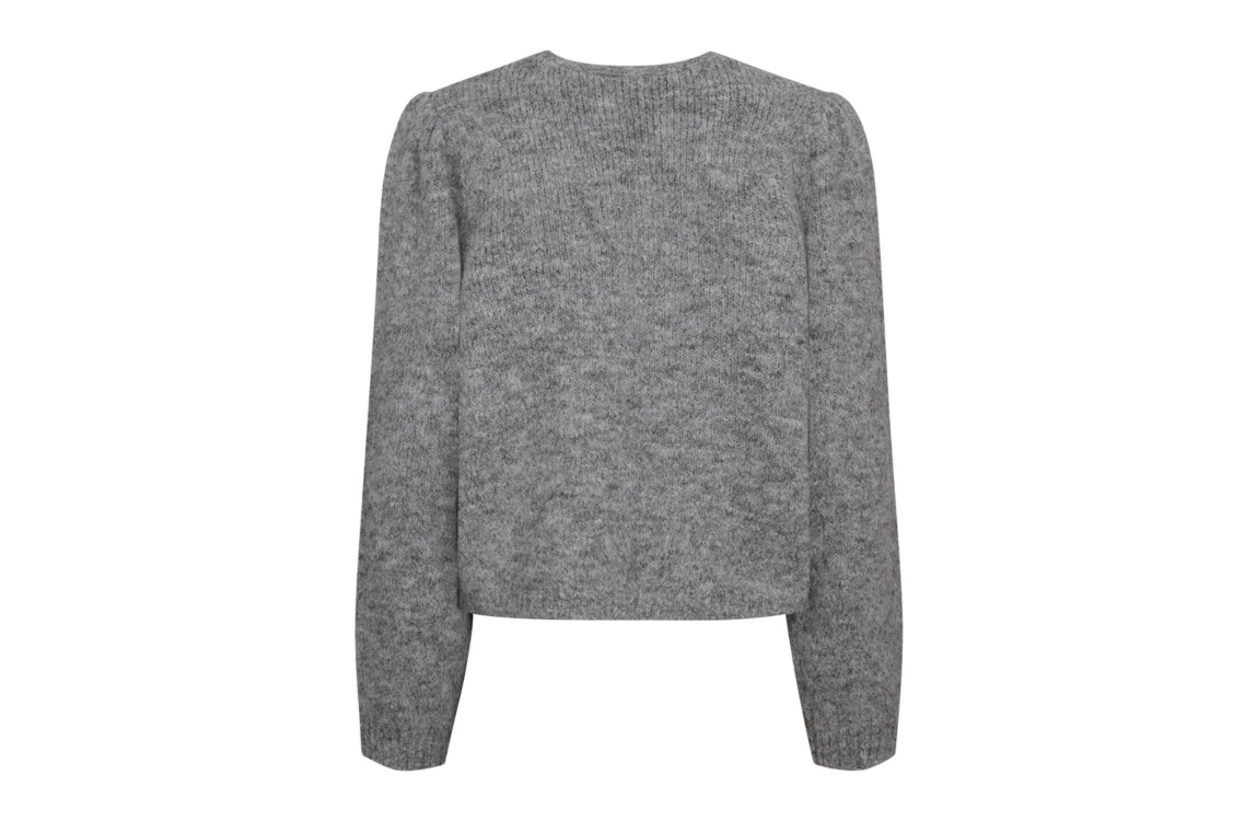 Dit rechtvallende model is voorzien van een v-hals en heeft lange pofmouwen. Dit grijze vest van Freequent sluit aan de voorzijde door middel van van twee strikken. Dit model is afgewerkt met ribgebreide boorden.