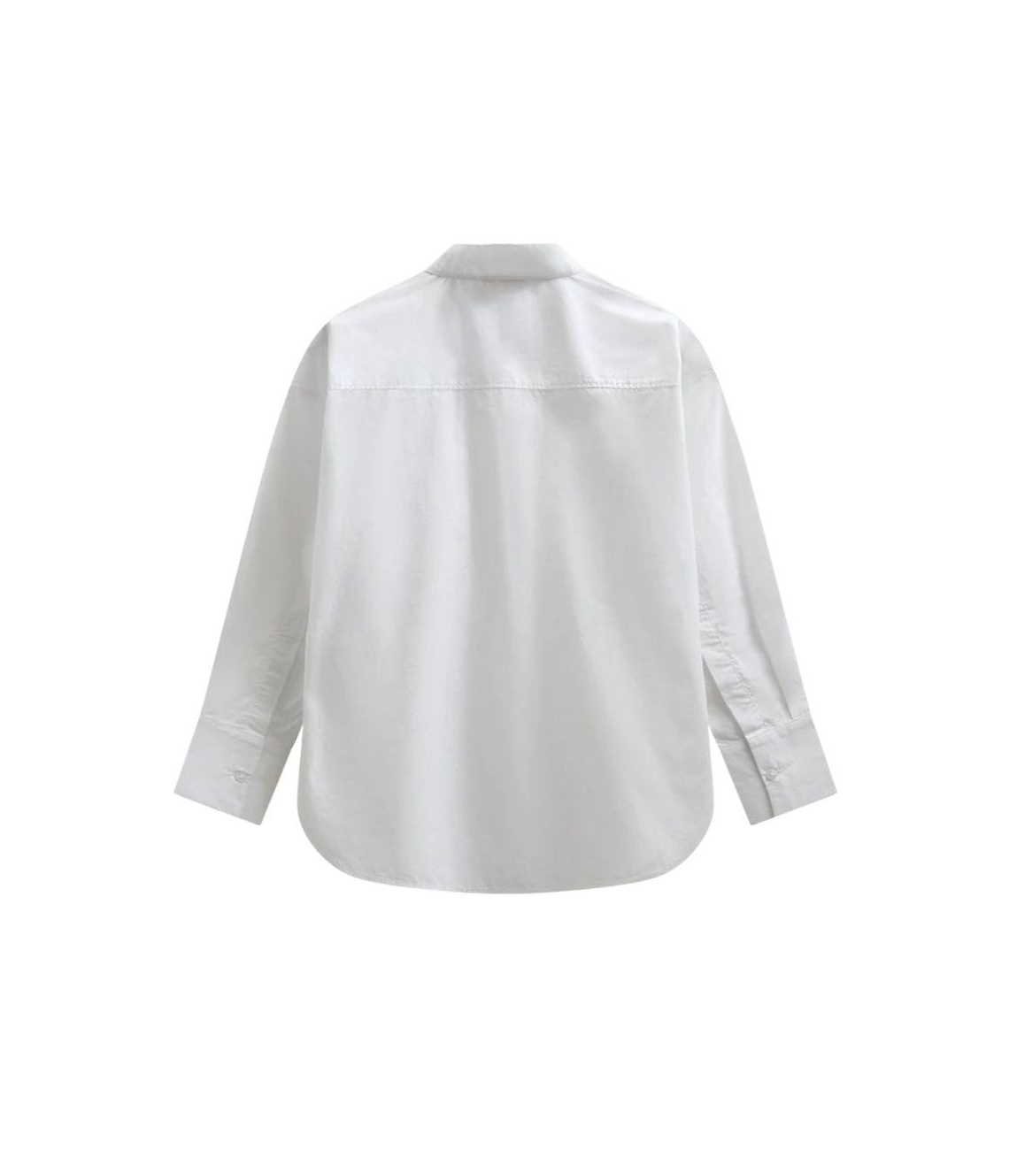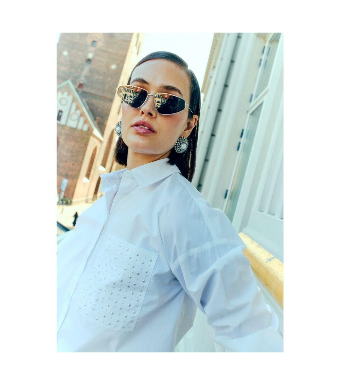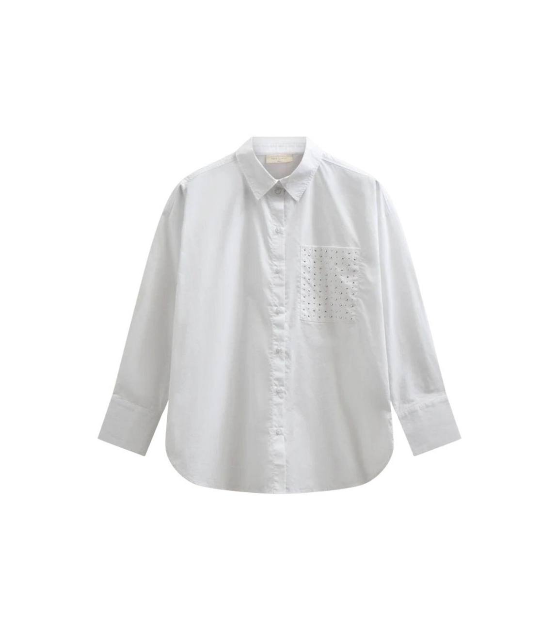 Freequent blouse FQKamille 207151. Dit rechtvallend model is voorzien van een kraag en heeft lange mouwen. Deze witte blouse van Freequent sluit door middel van knopen en is afgewerkt met een borstzakje bewerkt met zilver kleurige studs.