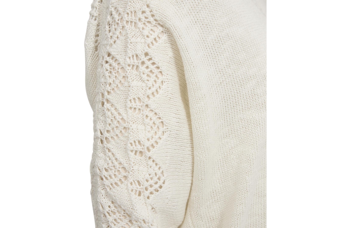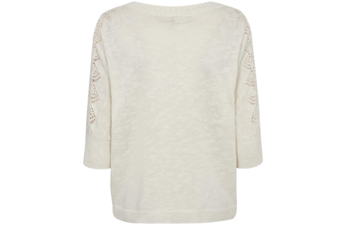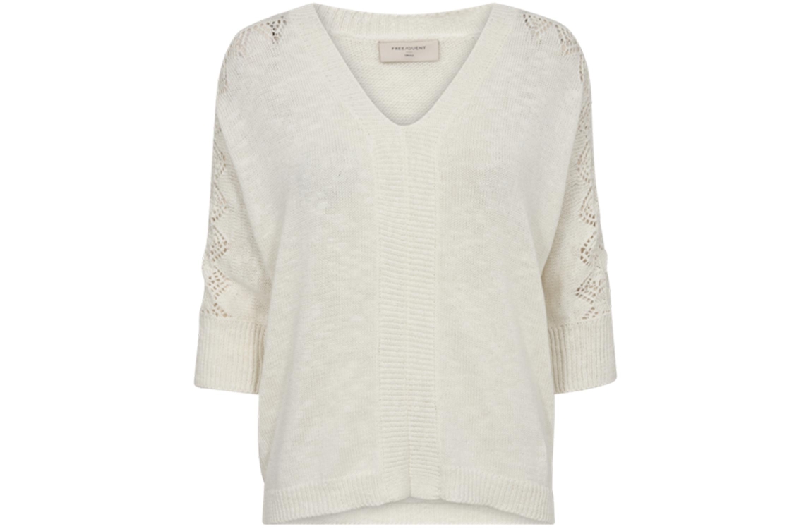 Freequent trui 203700. Dit rechtvallend model is voorzien van een v-hals en heeft driekwart mouwen. Deze off-white trui van Freequent is op de mouwen opengewerkt.