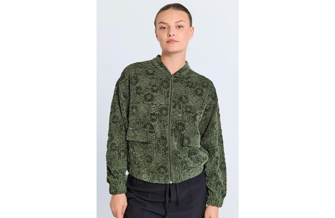Freequent jacket FQGRY 207142. Dit rechtvallend model is voorzien van een ronde hals en heeft lange mouwen. Deze groene velvet kanten jasje van Freequent sluit door middel van een rits en beschikt over twee klepzakken.