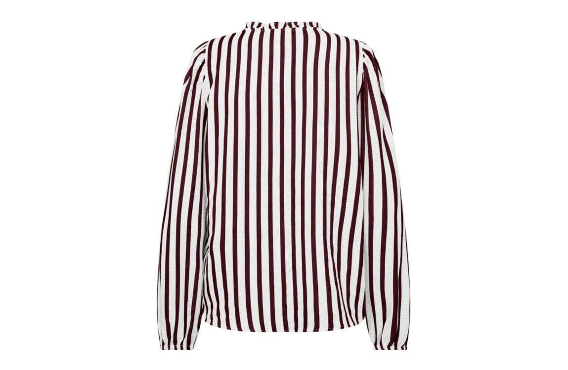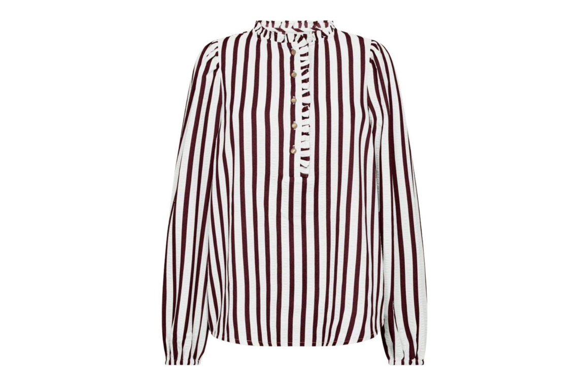 Freequent blouse FQNOTO 204913. Dit rechtvallend model is voorzien van een ronde hals en heeft lange mouwen. Deze gestreepte witte/burgubndy blouse van Freequent sluit door middel van knopen en is gedeeltelijk afgewerkt met ruches.
