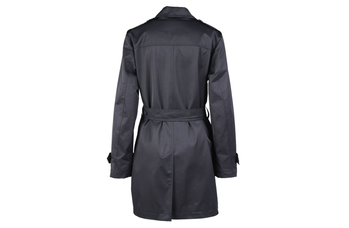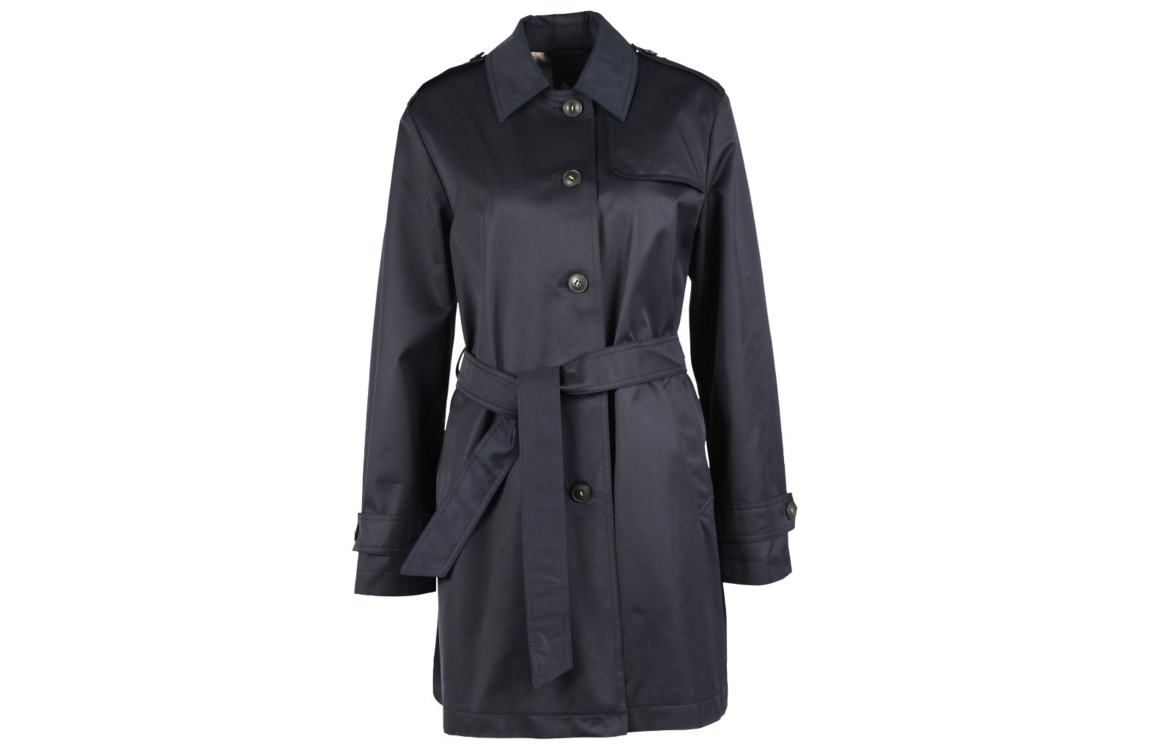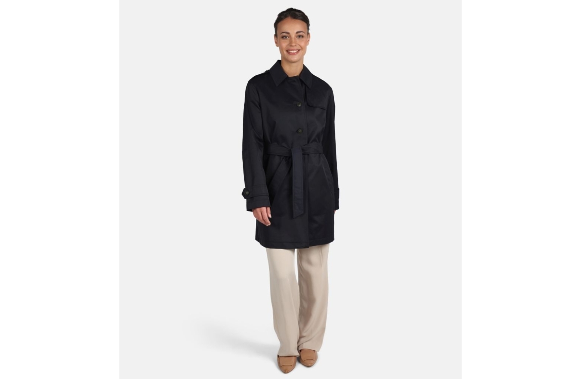 Fuchs Schmitt jas 300424693. Dit rechtvallende model is voorzien van een uitstaande kraag, lange mouwen en sluit door middel van knopen en een ceintuur. Deze donkerblauwe jas van Fuchs Schmitt is voorzien van verschillende accenten met knopen waardoor de jas een' trenchcoat' look krijgt. Deze jas is voorzien van openstaande steekzakken op het voorpand.