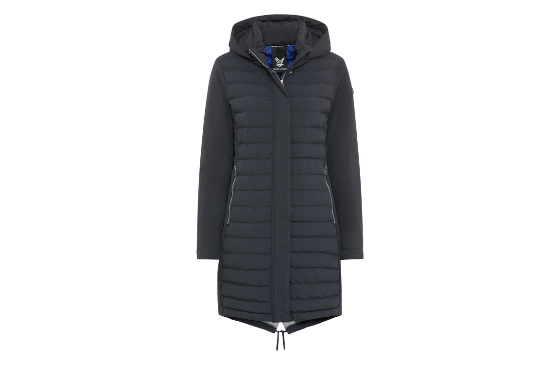Fuchs Schmitt jas 602014702. Dit rechtvallend model is voorzien van een afneembare capuchon met een trekkoord en heeft lange mouwen afgewerkt met een merkembleem. Deze donkerblauwe gewatteerde jas van Fuchs Schmitt sluit door middel van een rits en drukknopen en beschikt over ritszakken aan de voorzijde