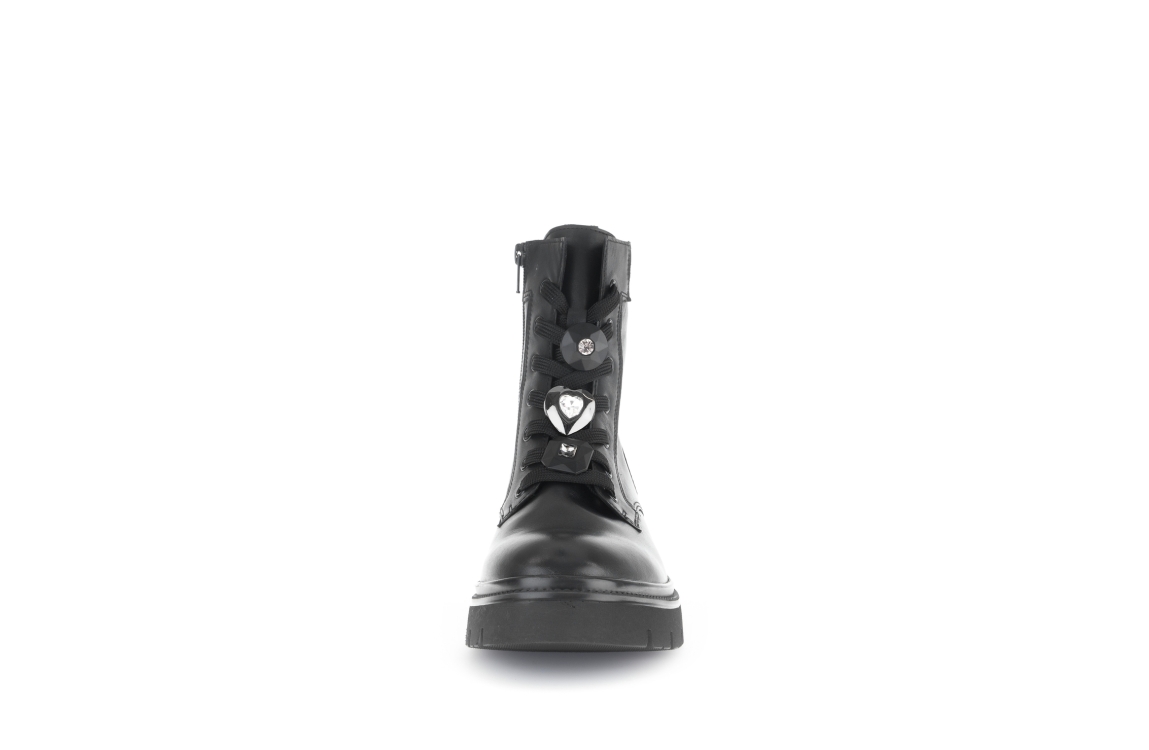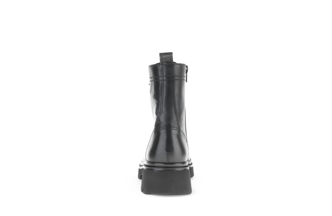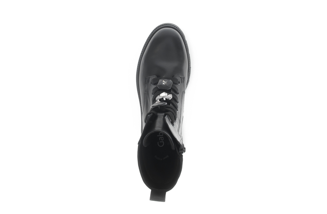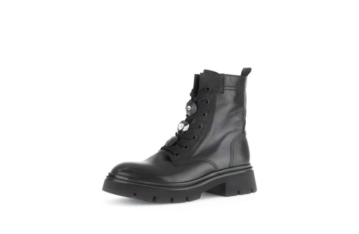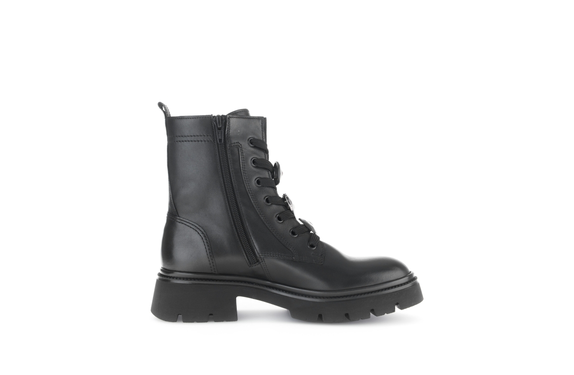 Gabor laars 51.853.27. Dit aangesloten model sluit door middel van een rits en veters. Deze zwarte laars van Gabor is voorzien van stenen op de voorzijde, een chunky zwarte zool en uitgevoerd met een zacht binnen materiaal.