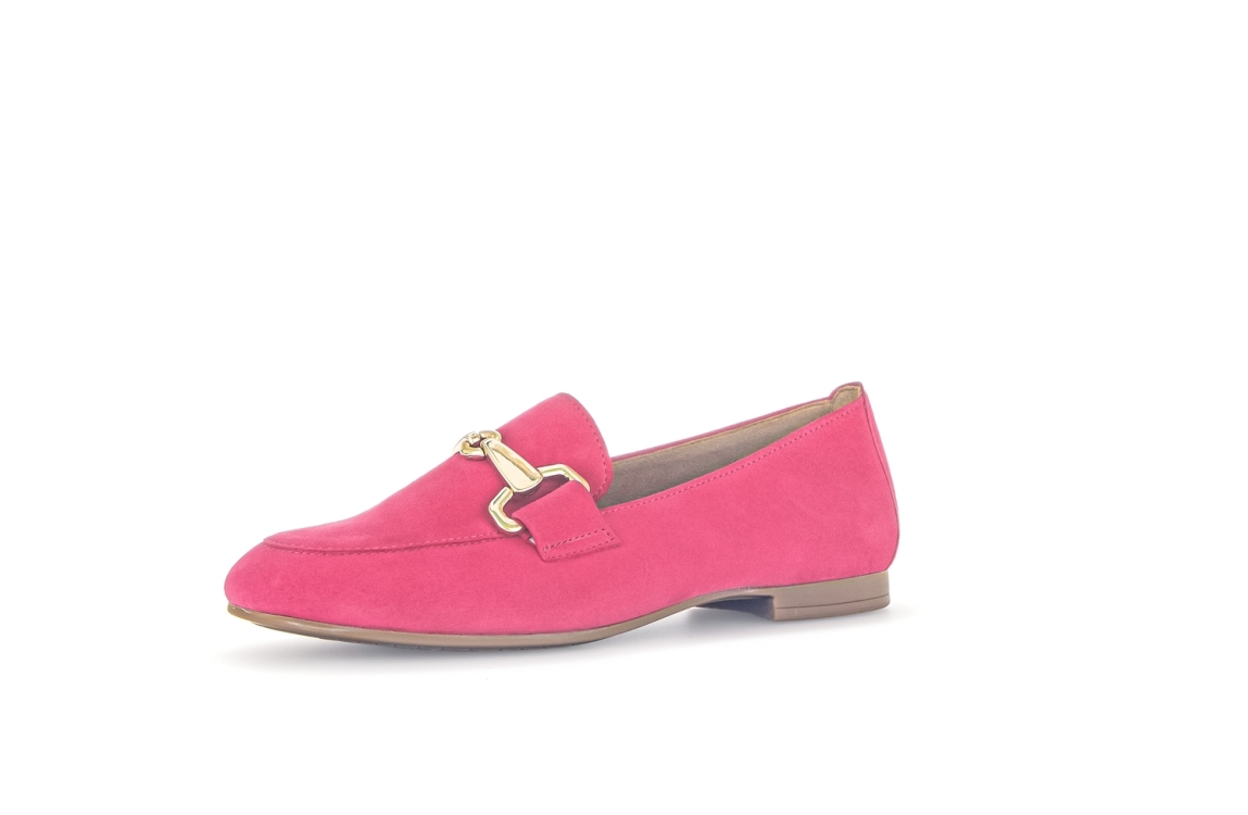Gabor instapper 45.211.34. Dit roze suede model is bewerkt met een goudkleurige gesp op de wreef en beschikt over een zwarte zool.