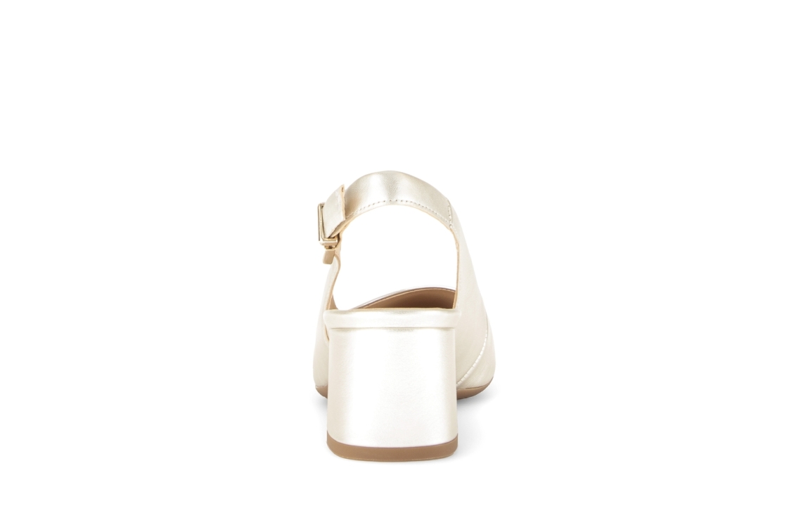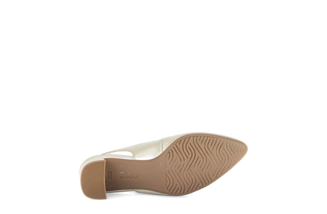 Gabor pumps 82.260.81. Dit instapmodel is voorzien van een puntige neus. Deze goudkleurige pump van Gabor is bewerkt met een beklede hak van 5 cm en sluit door middel van een gesp. Dit model heeft een open hiel.