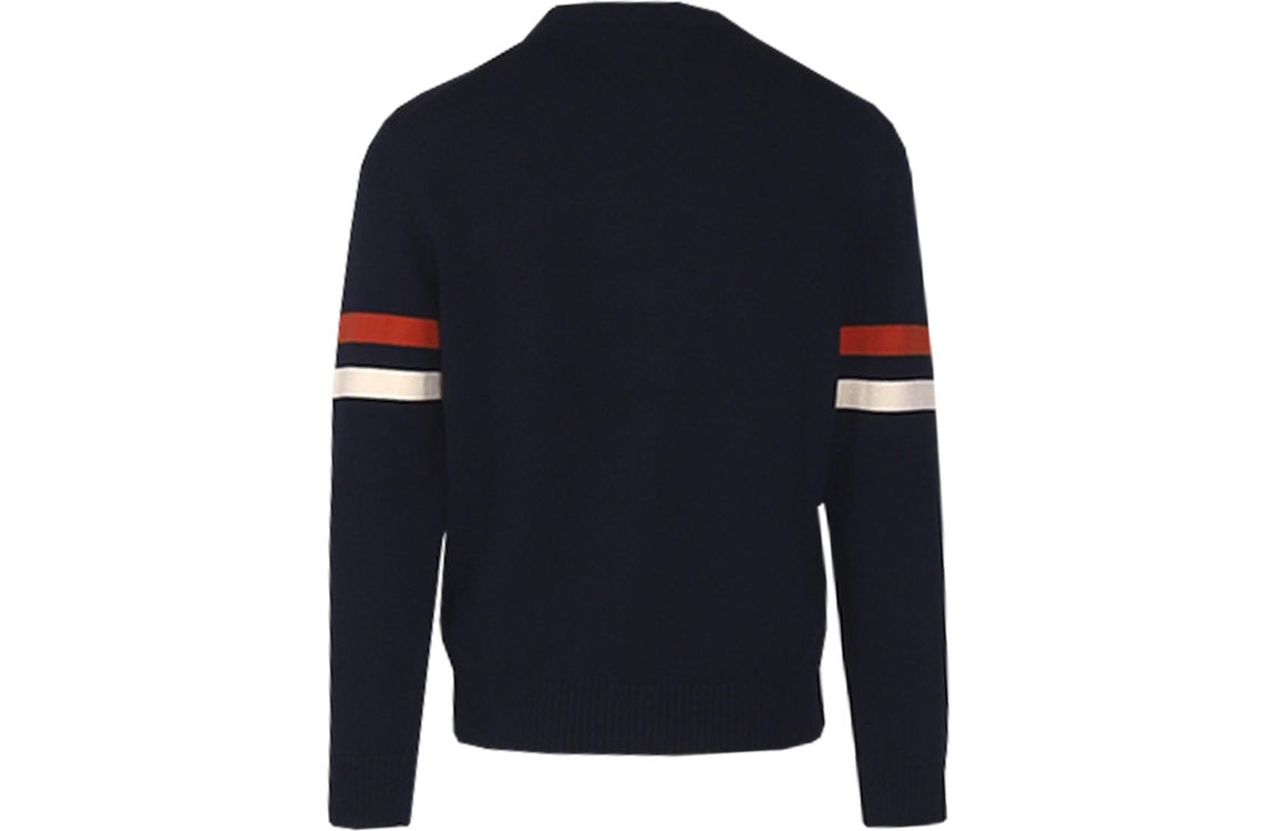 Gant trui 8030264-433. Dit rechtvallend model is voorzien van een ronde hals en heeft lange mouwen. Deze donkerblauwe trui van Gant is bewerkt met een grote badge aan de voorzijde en is afgewerkt met oranje en witte strepen op de mouwen.