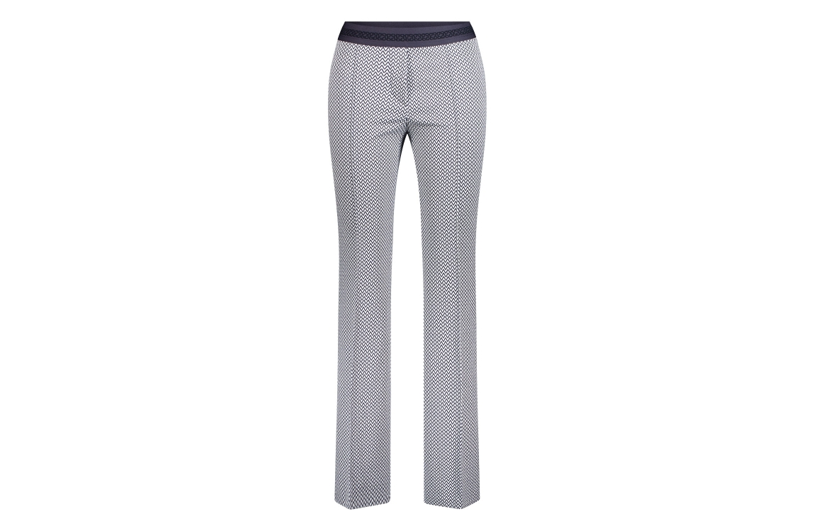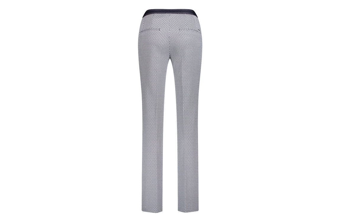 Gardeur broek ZARIA 645591 4065. Dit slim fit model sluit door middel van een gedetailleerde, elastische boord. Deze donkerblauwe broek van Gardeur is all-over bewerkt met een zigzagprint en is voorzien van twee paspelzakken aan de achterzijde.