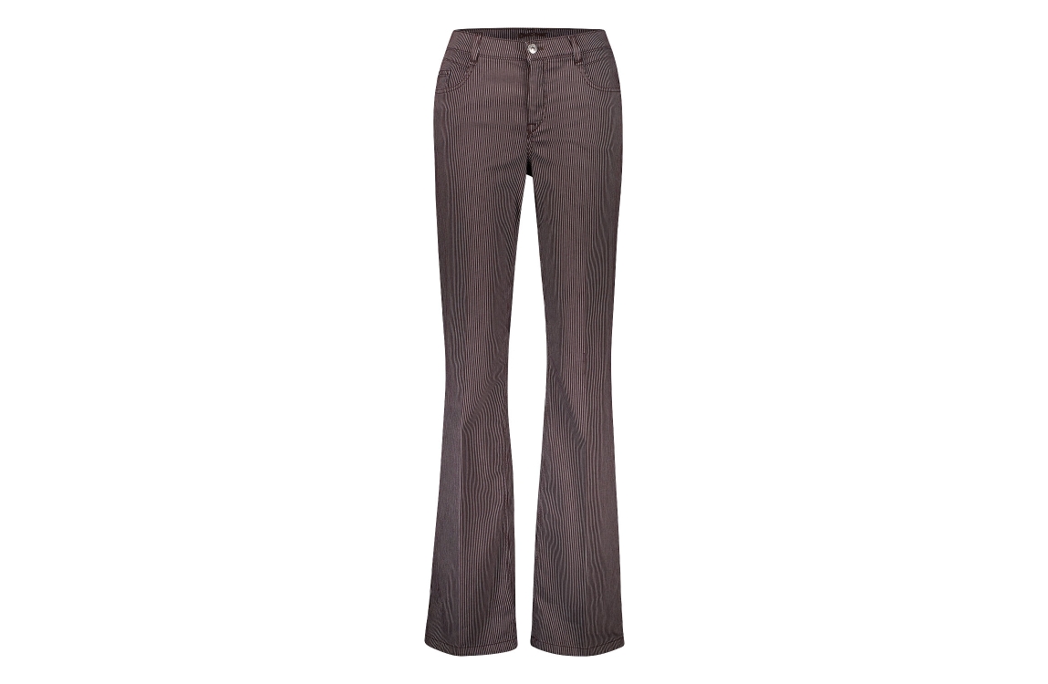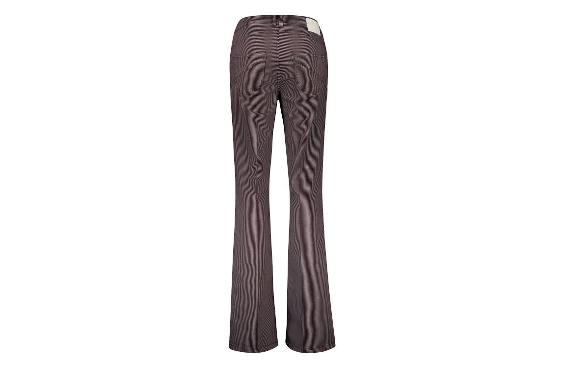 Gardeur broek ZURI126 80951. Dit slim fit model sluit door middel van een knoop- en ritssluiting en is voorzien van ceintuurlussen. Deze donkerbruine broek van Gardeur is all-over bewerkt met een streepprint en is uitgevoerd in een 5-pocket model.