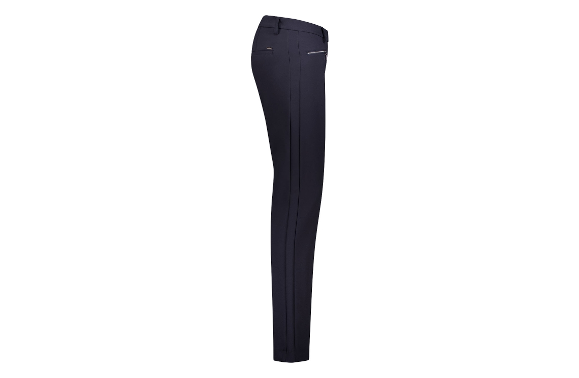 Gardeur broek ZENY 601801 1068. Dit regular fit model sluit door middel van een elastische boord en is voorzien van ceintuurlussen. Deze donkerblauwe broek van Gardeur beschikt over twee ritszakken aan de voorzijde en twee paspelzakken aan de achterzijde.