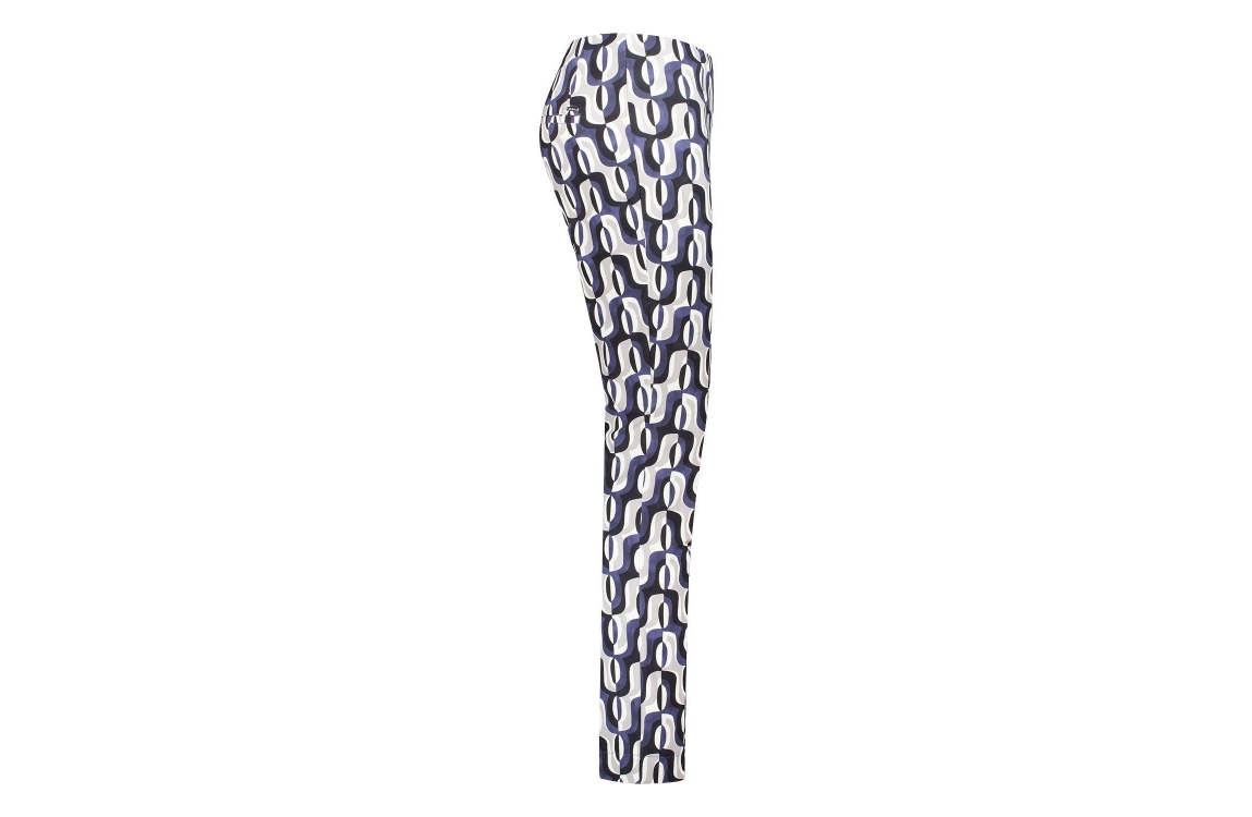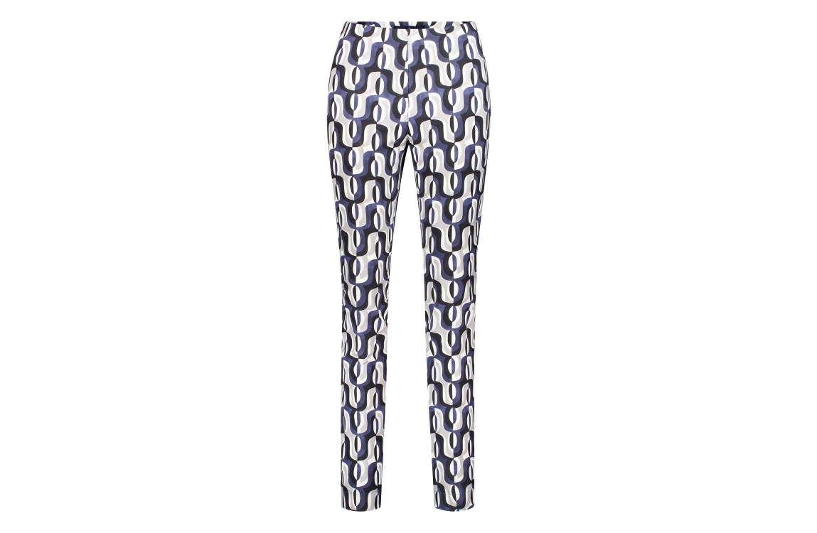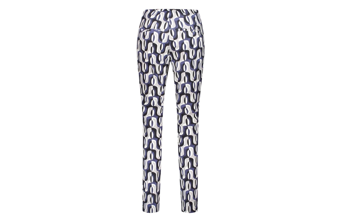 Gardeur broek zene14-645831. Dit aangesloten model sluit door middel van een elastische boord en is all-over bewerkt met een blauwe grafische print.