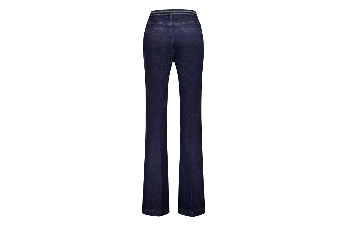 Gardeur broek ZillaA1 670701. Dit flared fit model sluit door middel van een gedetailleerde elastische boord en is voorzien van ceintuurlussen. Deze donkere denim broek van Gardeur beschikt over twee steekzakken aan de voorzijde en twee paspelzakken aan achterzijde.