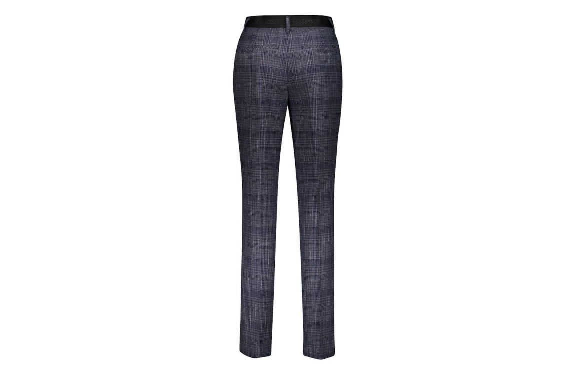 Gardeur FRIEDI1 broek 622371. Dit regular fit model sluit door middel van een rits, knoop en elastische boord. Deze donker blauwe Gardeur broek is bewerkt met een grafisch patroon. Dit model heeft aan de voorzijde twee steekzakken en twee paspelzakken aan de achterzijde.