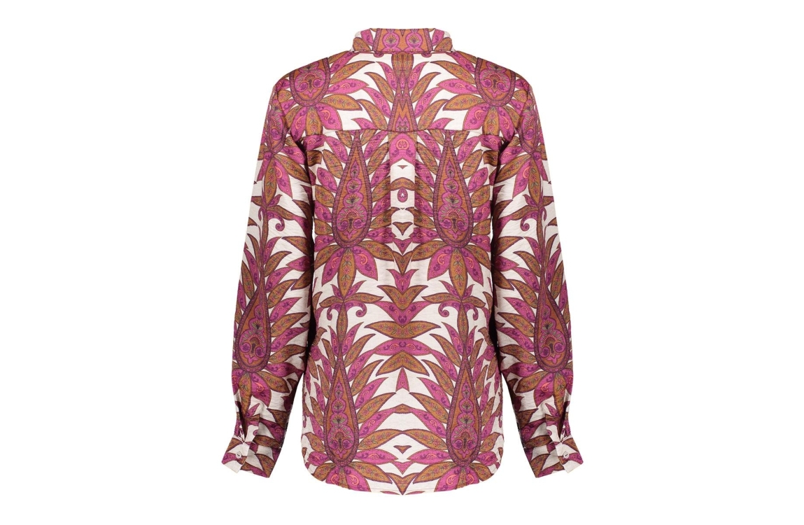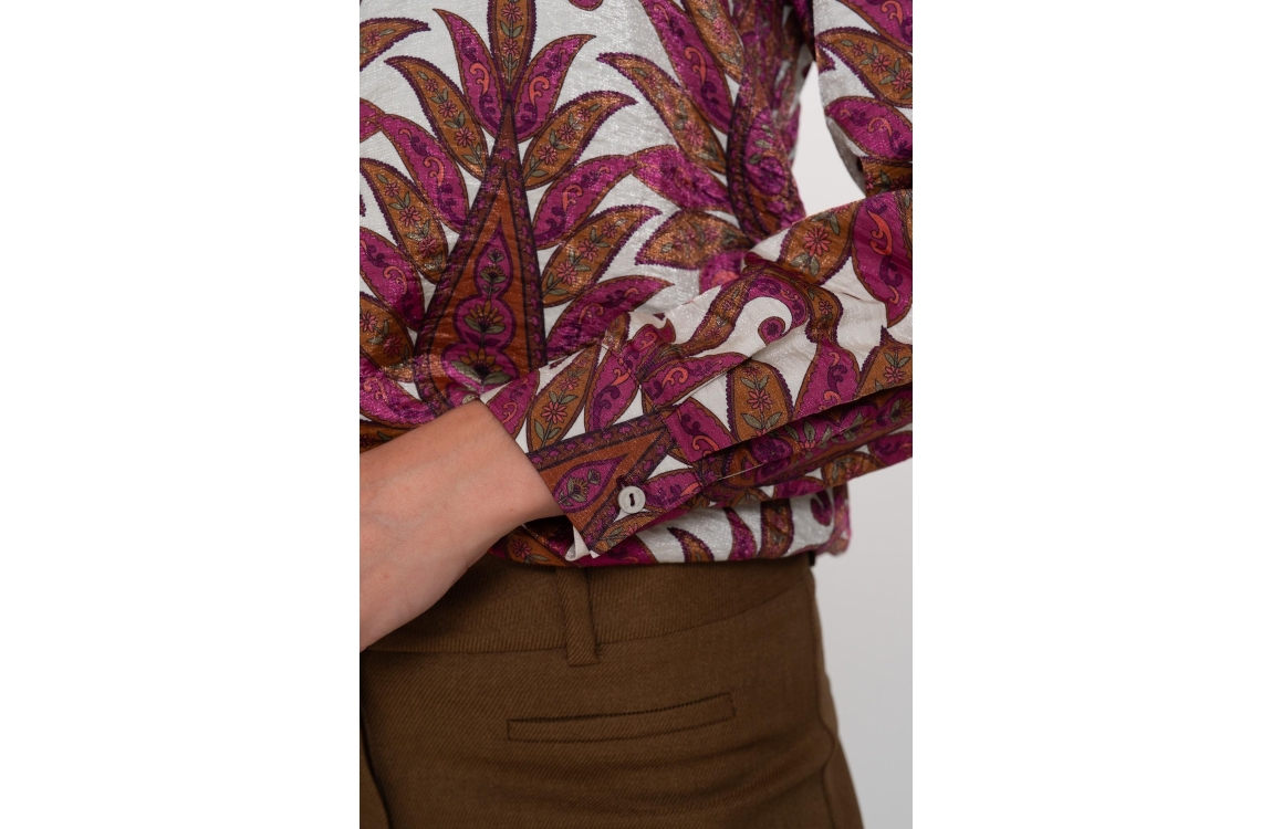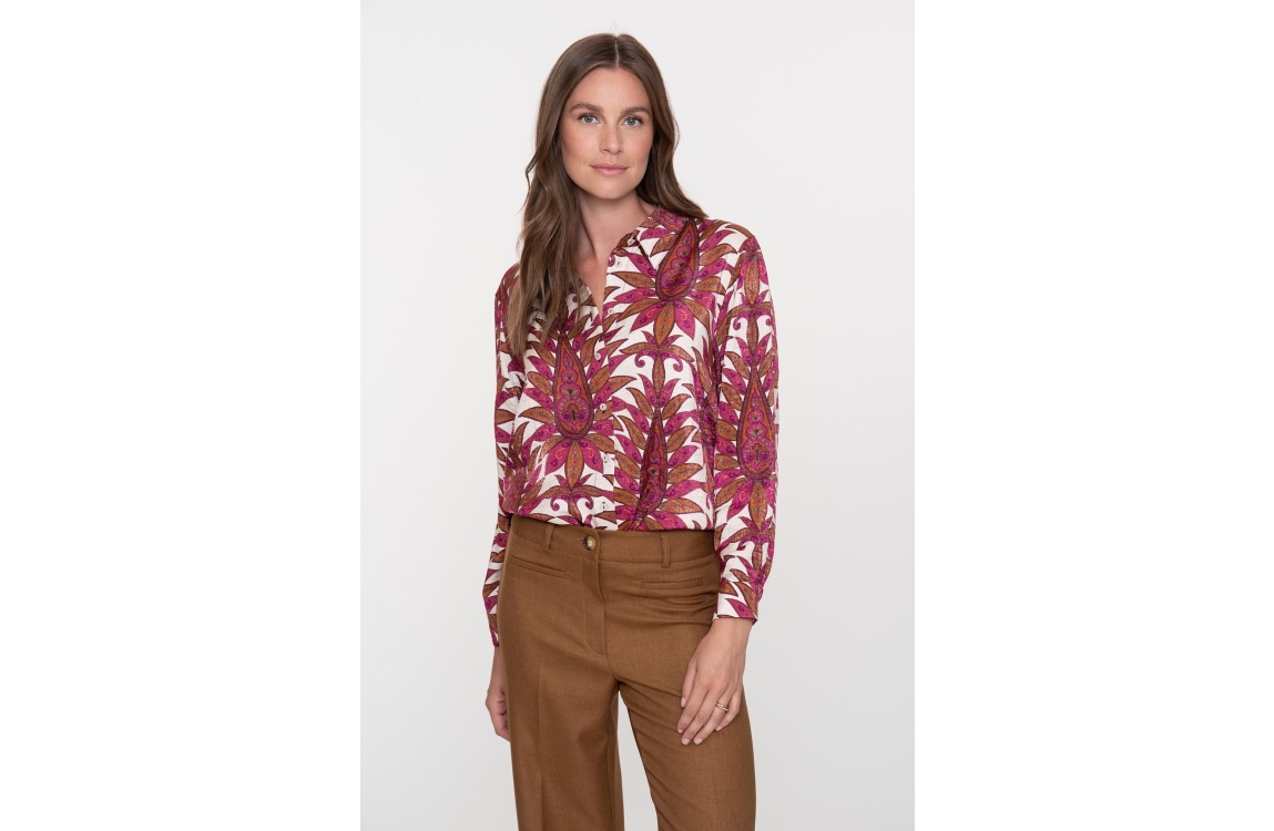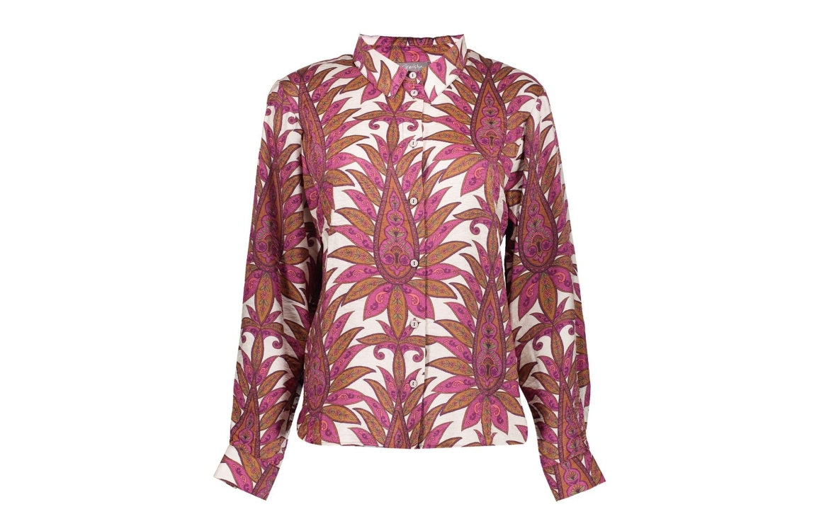 Geisha blouse. Dit rechtvallende model is voorzien van een kraag en heeft lange mouwen. Deze off-white blouse van Geisha sluit door middel van knopen en is all-over bewerkt met een grafische bladprint en glanzende stof.