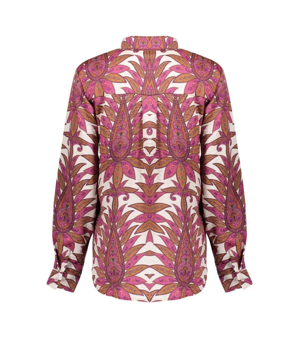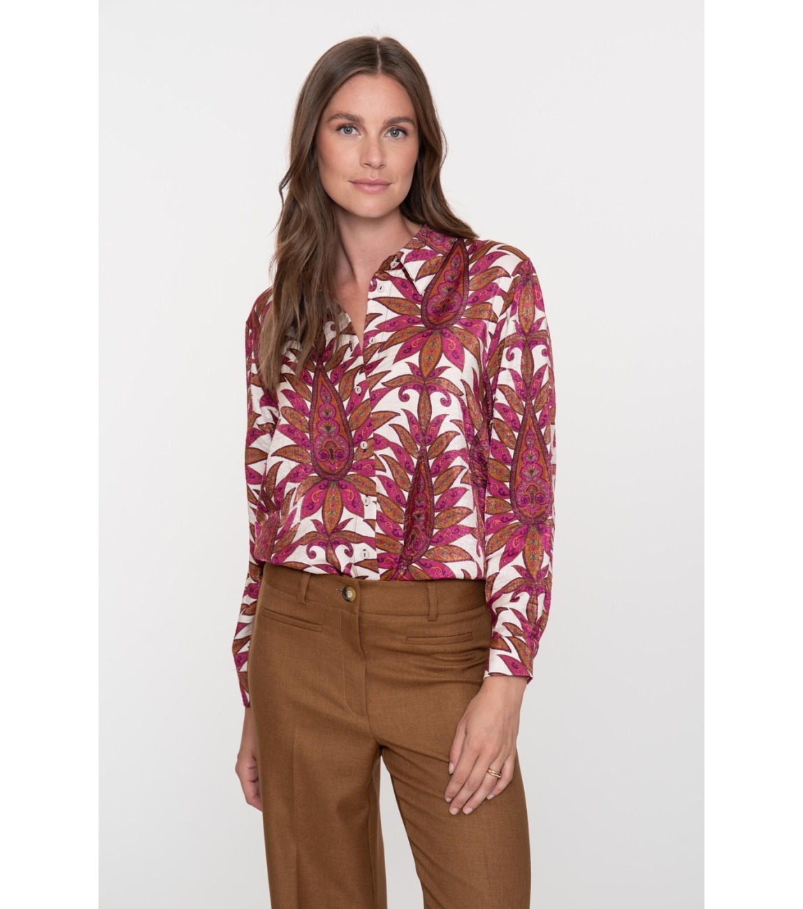 Geisha blouse. Dit rechtvallende model is voorzien van een kraag en heeft lange mouwen. Deze off-white blouse van Geisha sluit door middel van knopen en is all-over bewerkt met een grafische bladprint en glanzende stof.