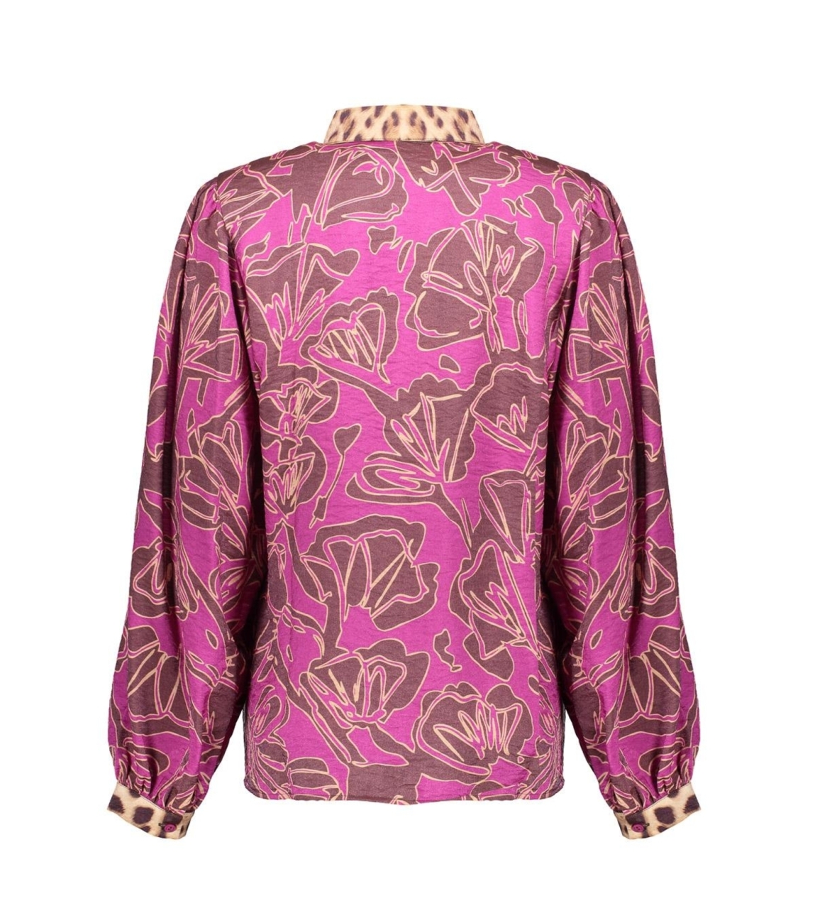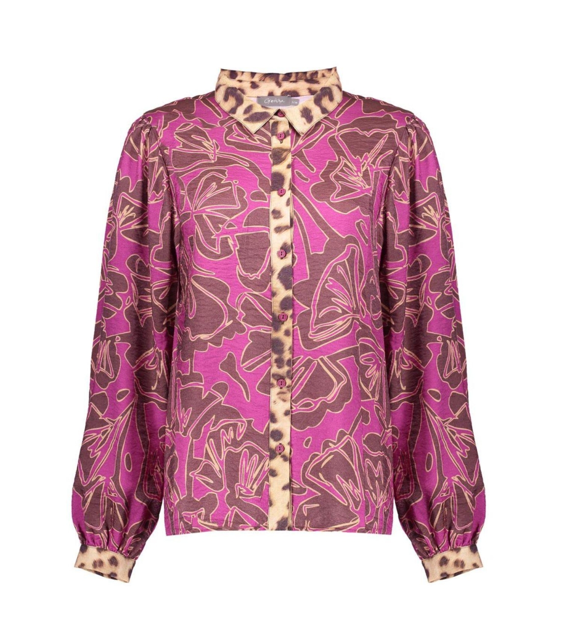 Geisha blouse. Dit rechtvallende model heeft een omgeslagen kraag en lange ballonmouwen. Deze multi-colour blouse van Geisha sluit aan de voorzijde door middel van knopen en is all-over bewerkt met een print en glanzende stof.