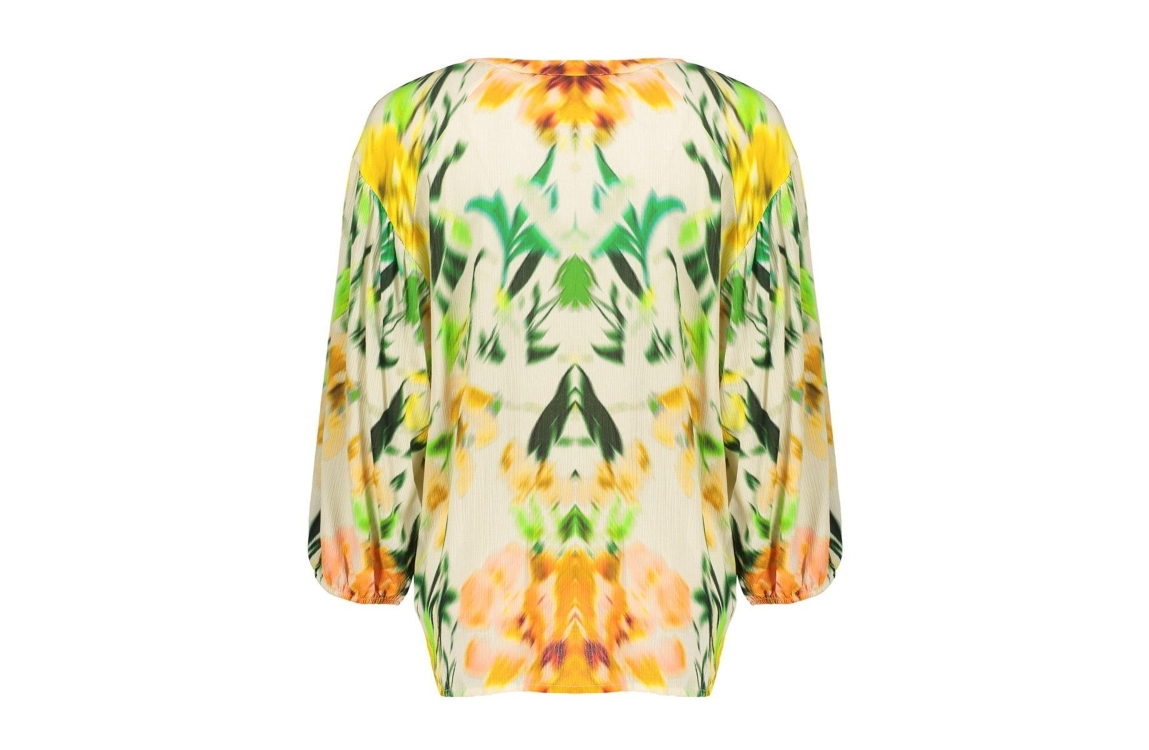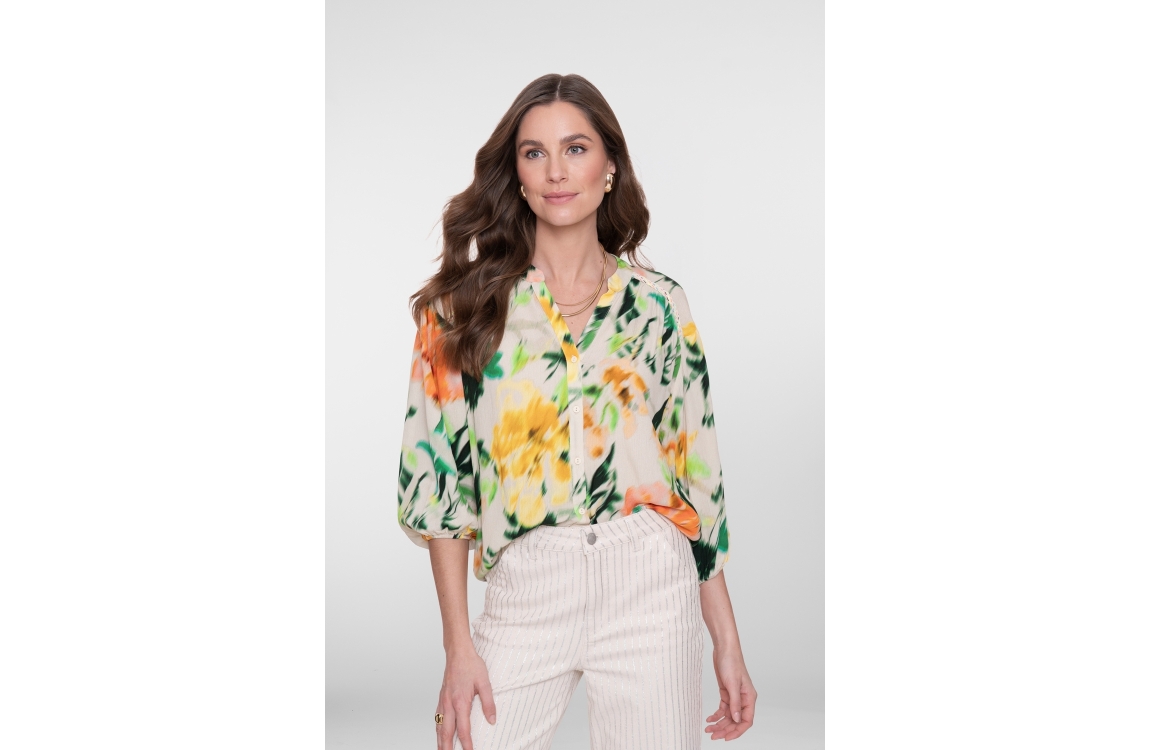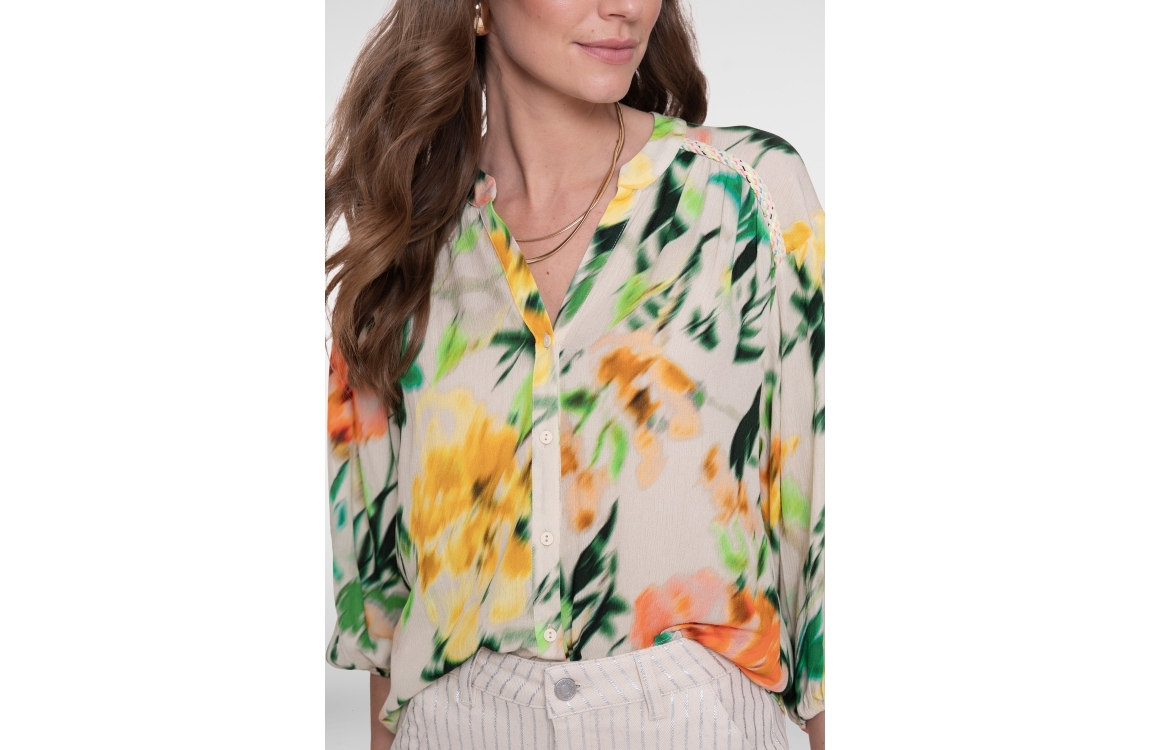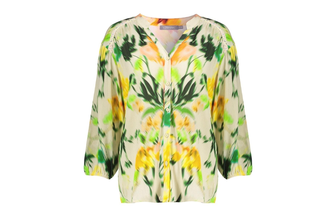 Geisha blouse 718 Ecru. Dit rechtvallende model heeft een ronde hals met V-inkeping en driekwart mouwen. Deze multi-colour blouse van Geisha is all-over bewerkt met een grafische print en sluit aan de voorzijde door middel van knopen.