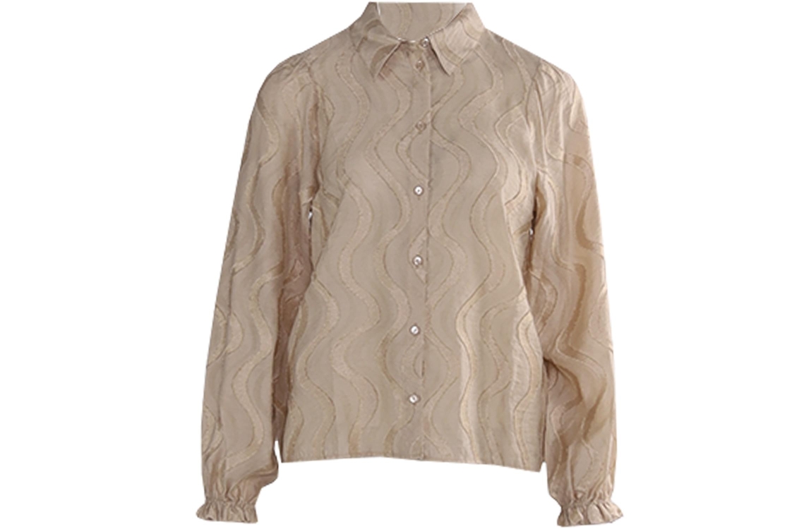 Geisha blouse 53964-20 720. Dit rechtvallende model heeft een kraag en lange mouwen. Deze zandkleurige blouse van Geisha sluit aan de voorzijde door middel van knopen en is uitgevoerd in semi-transparante kwaliteit. Het model is all-over bewerkt met een golvende structuur en ruffles.