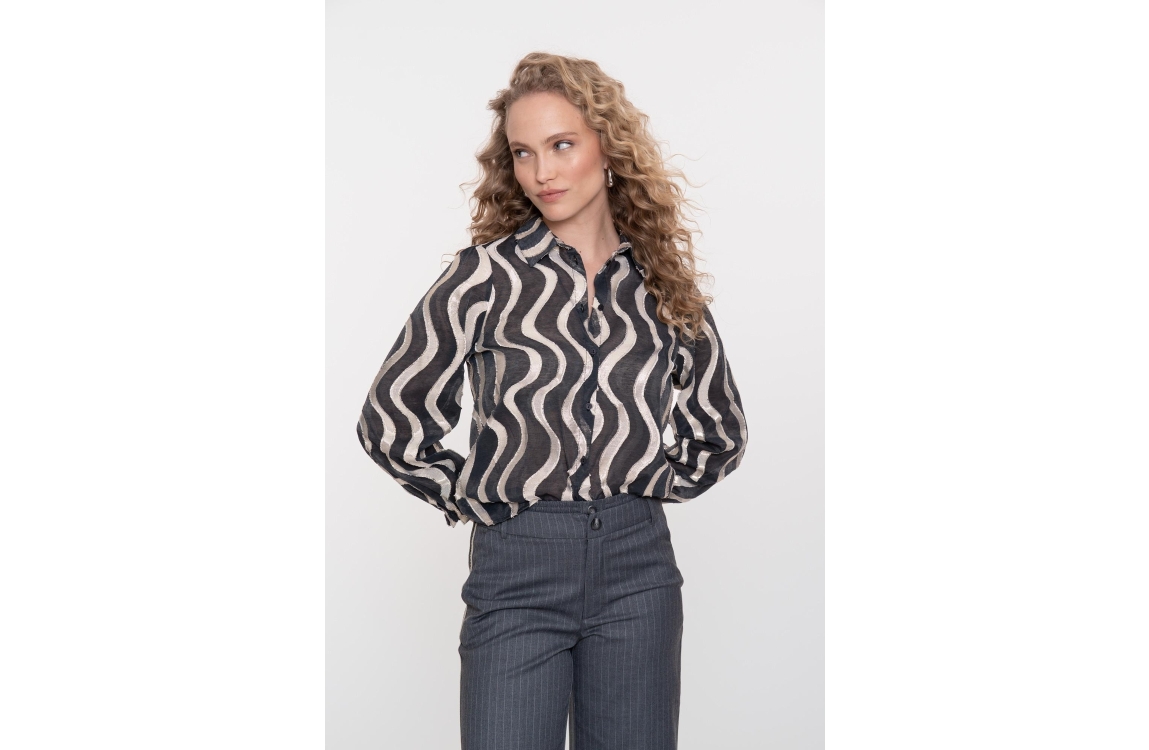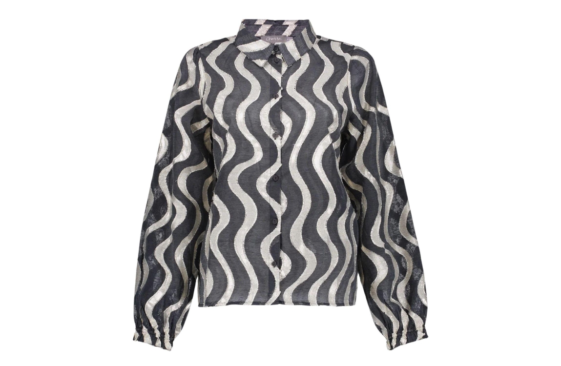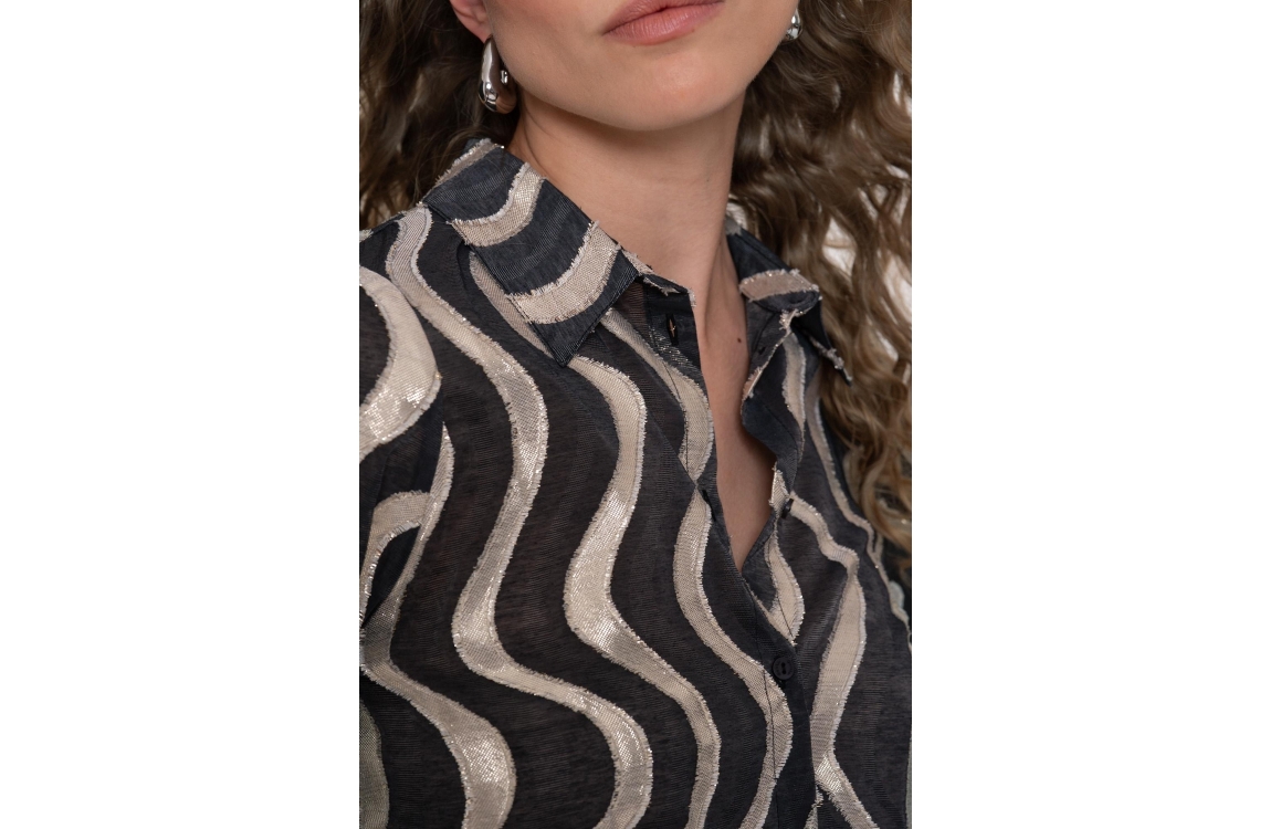 Geisha blouse 999 Black. Dit rechtvallende model heeft een klassieke kraag en lange mouwen met ruffle machetten. Deze zwarte blouse van Geisha sluit aan de voorzijde door middel van knopen en is all-over bewerkt met een glanzende print met golvende lijnen in een contrasterende metallic tint. Het model is 178cm lang en draagt maat S/36.