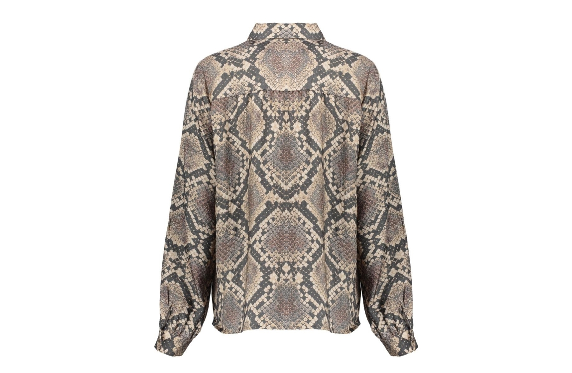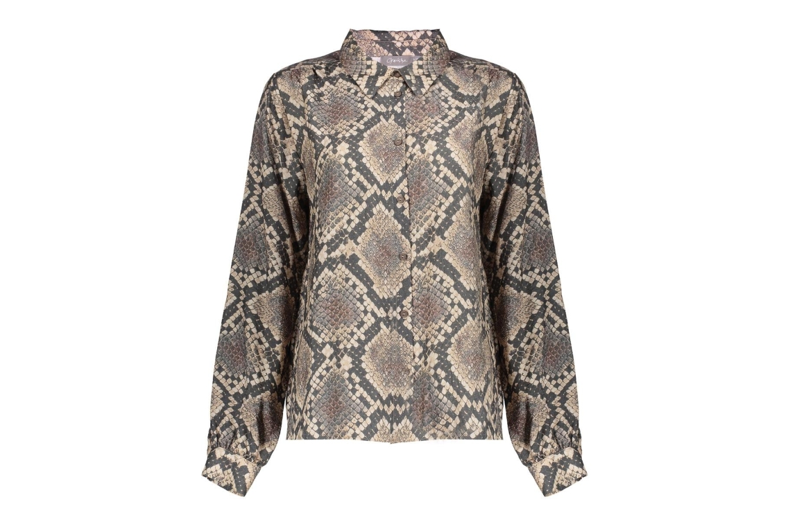 Geisha Blouse animal 999 Black. Dit rechtvallende model heeft een kraag en lange mouwen. Deze zwarte blouse van Geisha sluit aan de voorzijde door middel van knopen en is all-over bewerkt met een slangenprint.
