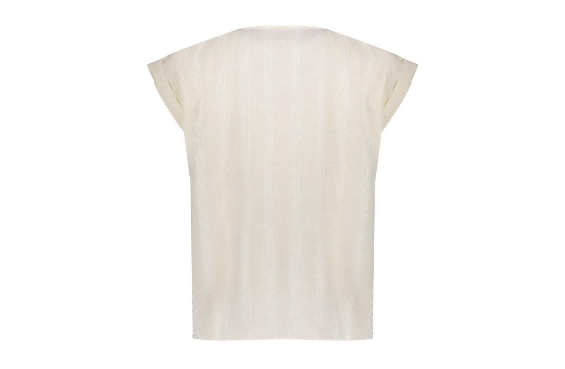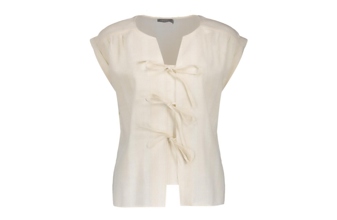Geisha blouse bow 63152-32. Dit rechtvallend model is voorzien van een ronde hals met v-inkeping en heeft korte mouwen. Deze zandkleurige blouse van Geisha sluit door middel van strikjes aan de voorzijde en is bewerkt met goudkleurige lurexdraden all-over.