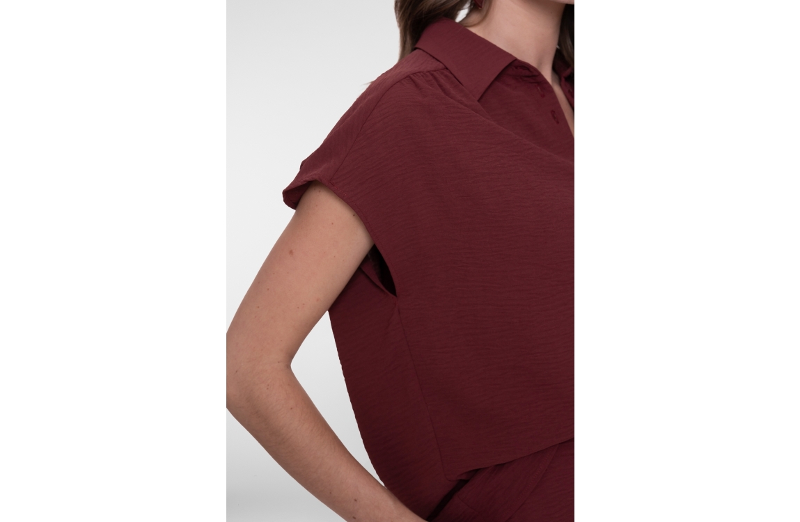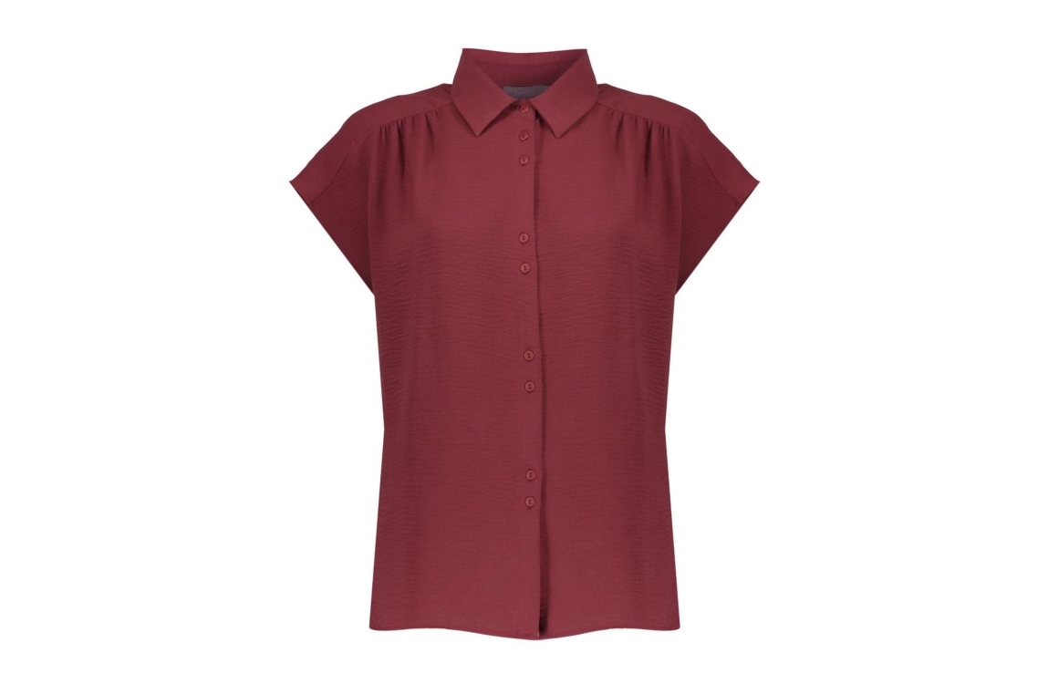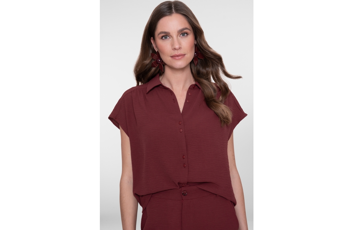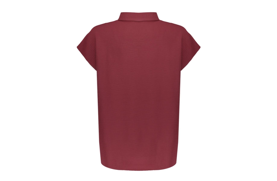 Geisha blouse crinckle 63140-21. Dit rechtvallend model is voorzien van een kraag en heeft korte kapmouwen. Deze cherry rode blouse van Geisha sluit door middel van knopen.