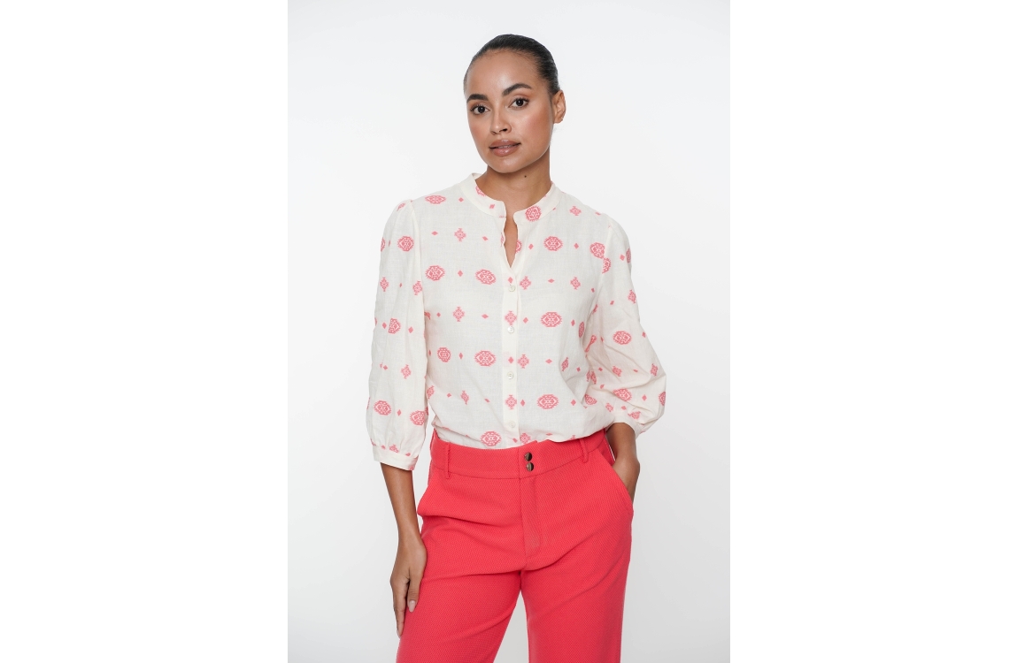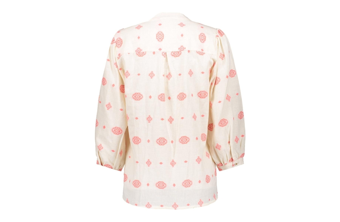 Geisha blouse 53176-70. Dit rechtvallend model is voorzien van een ronde hals en heeft driekwart mouwen. Deze beige blouse van Geisha sluit door middel van knopen en is bewerkt met roze embroidery.