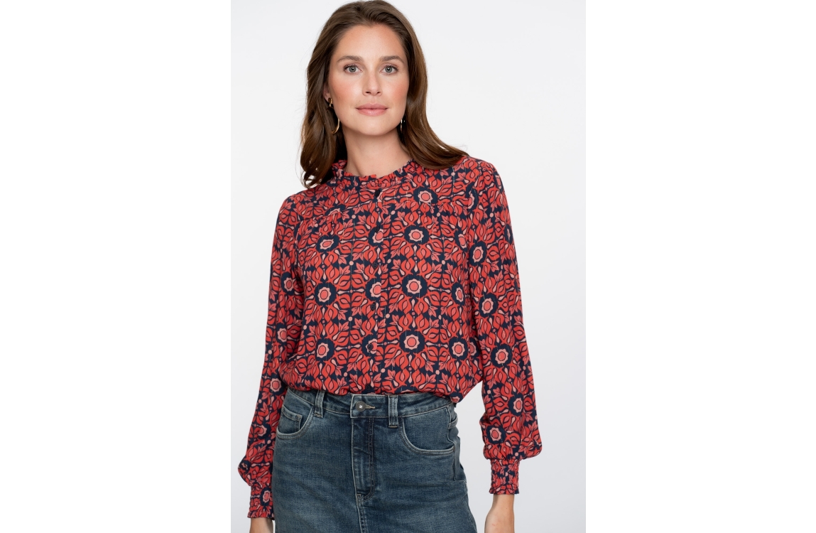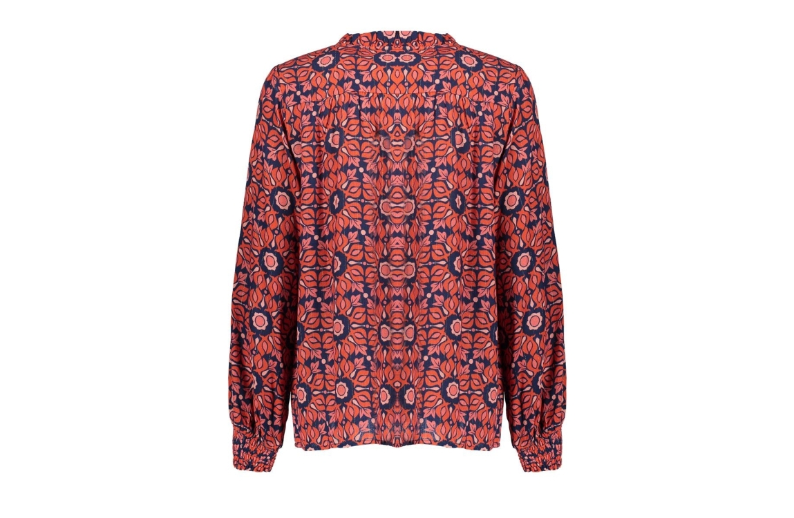 Geisha blouse 53611-20. Dit rechtvallende model heeft een ronde halslijn en lange mouwen met elastische boorden. Deze multi-colour blouse van Geisha is all-over bewerkt met een grafische print in verschillende kleuren en sluit aan de voorzijde door middel van knopen.