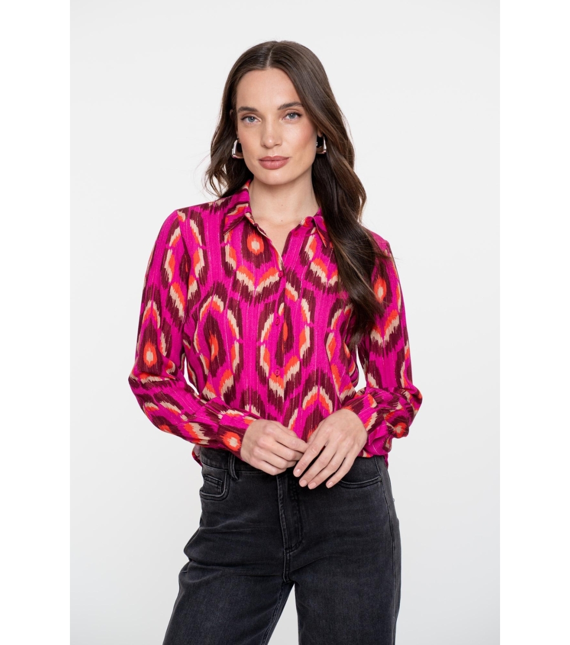 Geisha blouse 53635-20. Dit rechtvallend model is voorzien van een kraag en heeft lange mouwen. Deze roze blouse van Geisha sluit door middel van knopen en is allover bewerkt met een print en goudkleurige lurex.