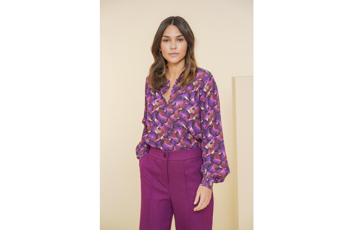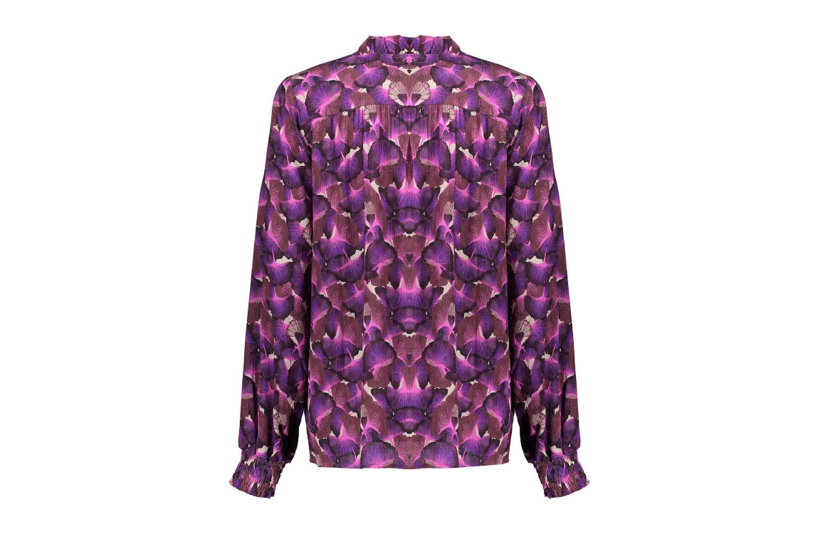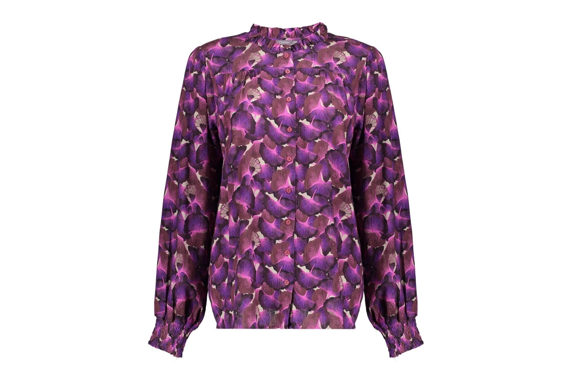 Geisha blouse 43958-20. Dit rechtvallend model is voorzien van een ronde hals met ruches en heeft lange mouwen. Deze paarse/fuchsia blouse van Geisha sluit door middel van knopen en is all-over bewerkt met een bloemenprint afgewerkt met een goudkleurige lurexdraad.