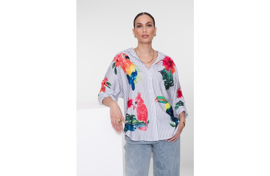 Geisha Blouse stripes & birds 600 Light blue. Dit soepelvallende model is voorzien van een kraag en heeft lange mouwen. Deze licht blauwe blouse van Geisa sluit door middel van knopen en heeft een langere achterkant. Dit model is all-over bewerkt met strepen en een kleurrijke tropische print met papegaaien, bloemen en bladeren.
