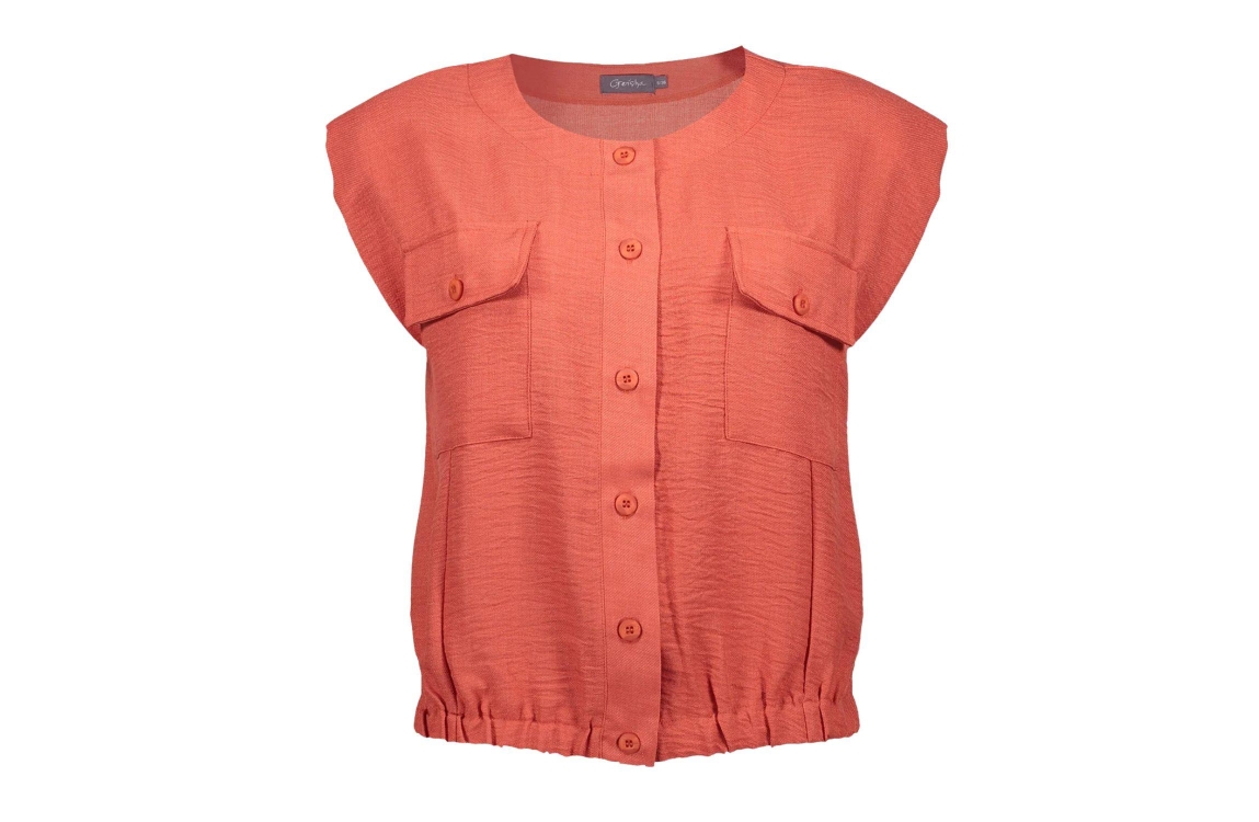 Geisha Blouse with pockets 00201 Burned orange. Dit rechtvallende model is voorzien van een ronde hals en is mouwloos. Deze oranje blouse van Geisha sluit door middel van knopen aan de voorzijde en is voorzien van borstzakken. Dit model is afgewerkt met een elastische tailleband.