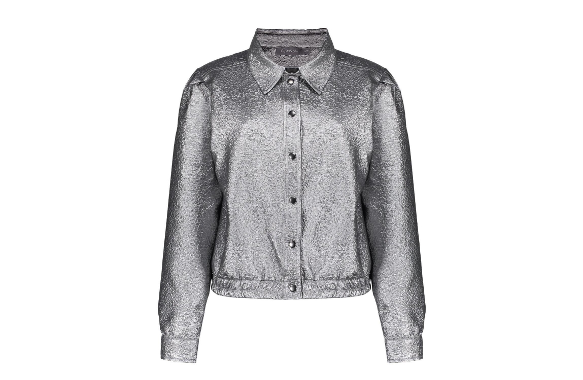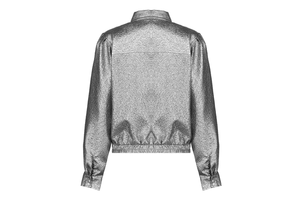 Geisha Online jasje 45103-20. Dit bomber model heeft een kraag en lange mouwen. Deze zilverkleurige jas van Geisha sluit aan de voorzijde door middel van drukknopen en is all-over bewerkt met een jacquard structuur. Dit model beschikt over een elastische onderboord en is op de mouwen bewerkt met plooidetails.