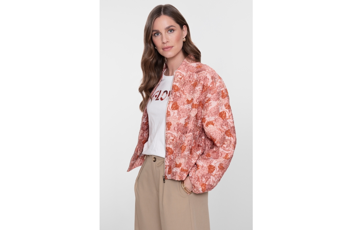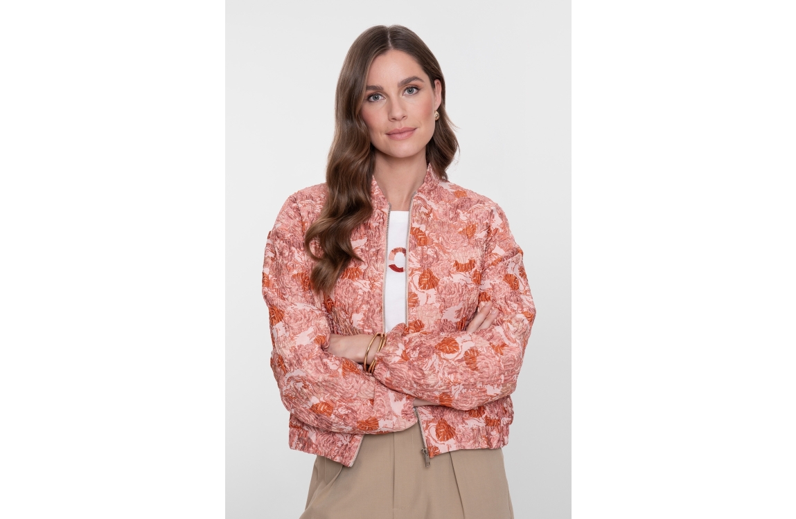 Geisha Bomber jacquard 420 Pink. Dit rechtvallende model is voorzien van een ronde hals en heeft lange mouwen. Dit roze bomber jasje van Geisha sluit door middel van een rits en is all-over bewerkt met een jacquard structuur. Dit model is afgewerkt met elastische boorden.