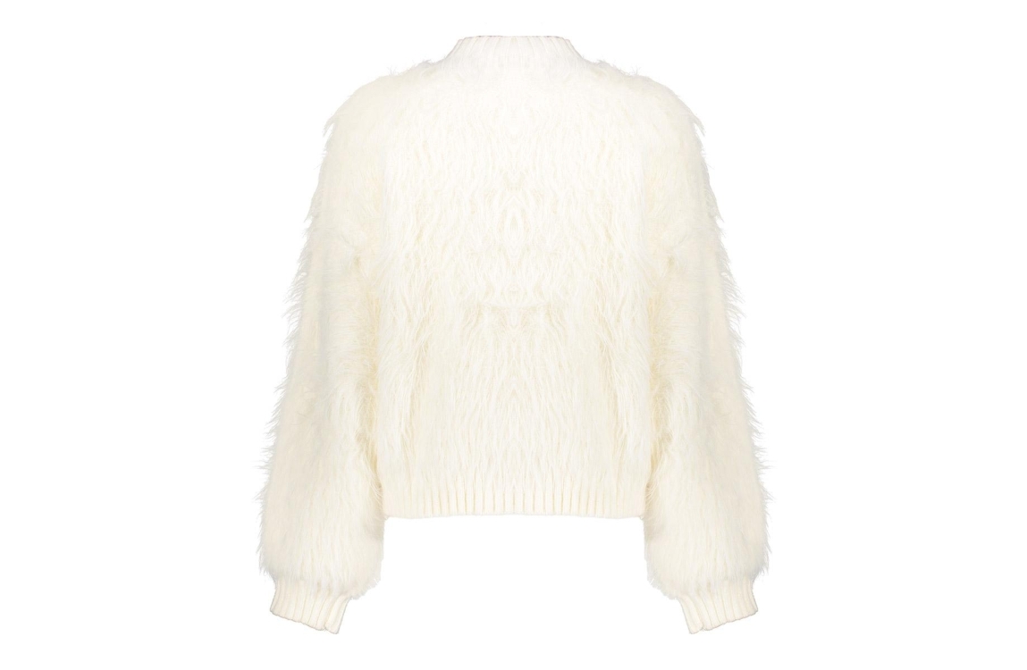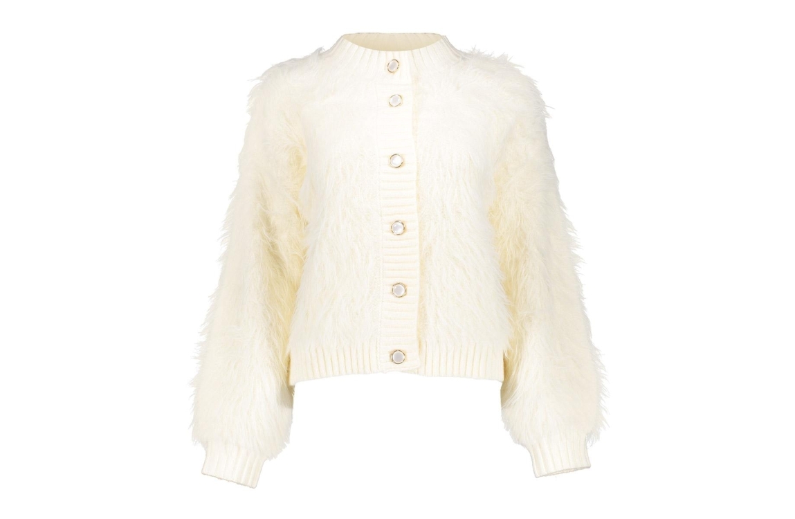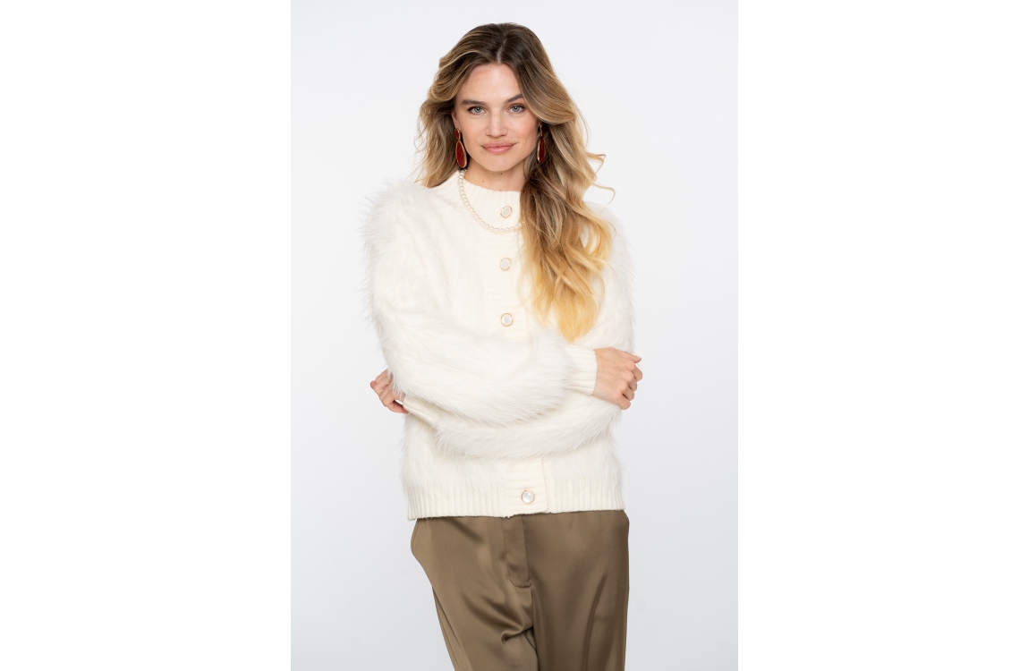 Geisha vest 54500-10. Dit rechtvallende model heeft een hoge, ronde halslijn en lange mouwen. Deze off-white vest/cardigan van Geisha sluit aan de voorzijde door middel van goudkleurige parelmoerknopen en is all-over uitgevoerd in furry kwaliteit. Het model is afgewerkt met ribgebreide boorden.