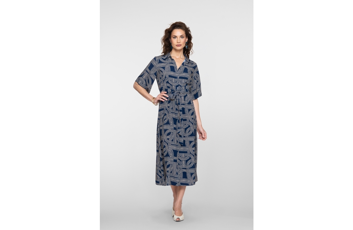 Geisha jurk 67053-70. Dit rechtvallend model is voorzien van een kraag en heeft korte mouwen. Deze donkerblauwe jurk van Geisha sluit door middel van knopen en een strikkoord in de taille. Dit model is all-over bewerkt met een grafische print.