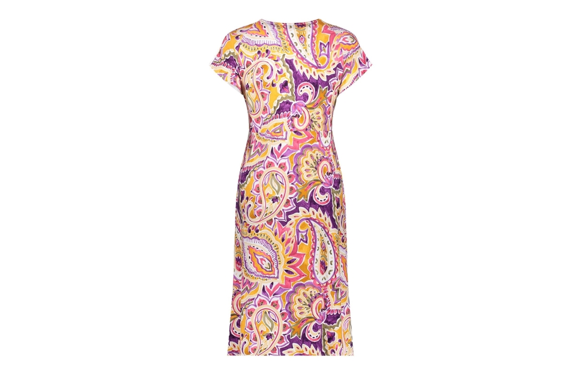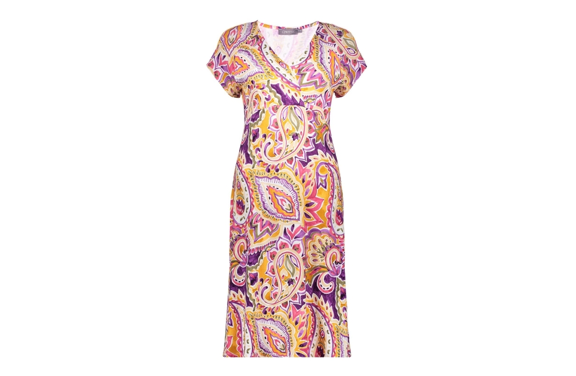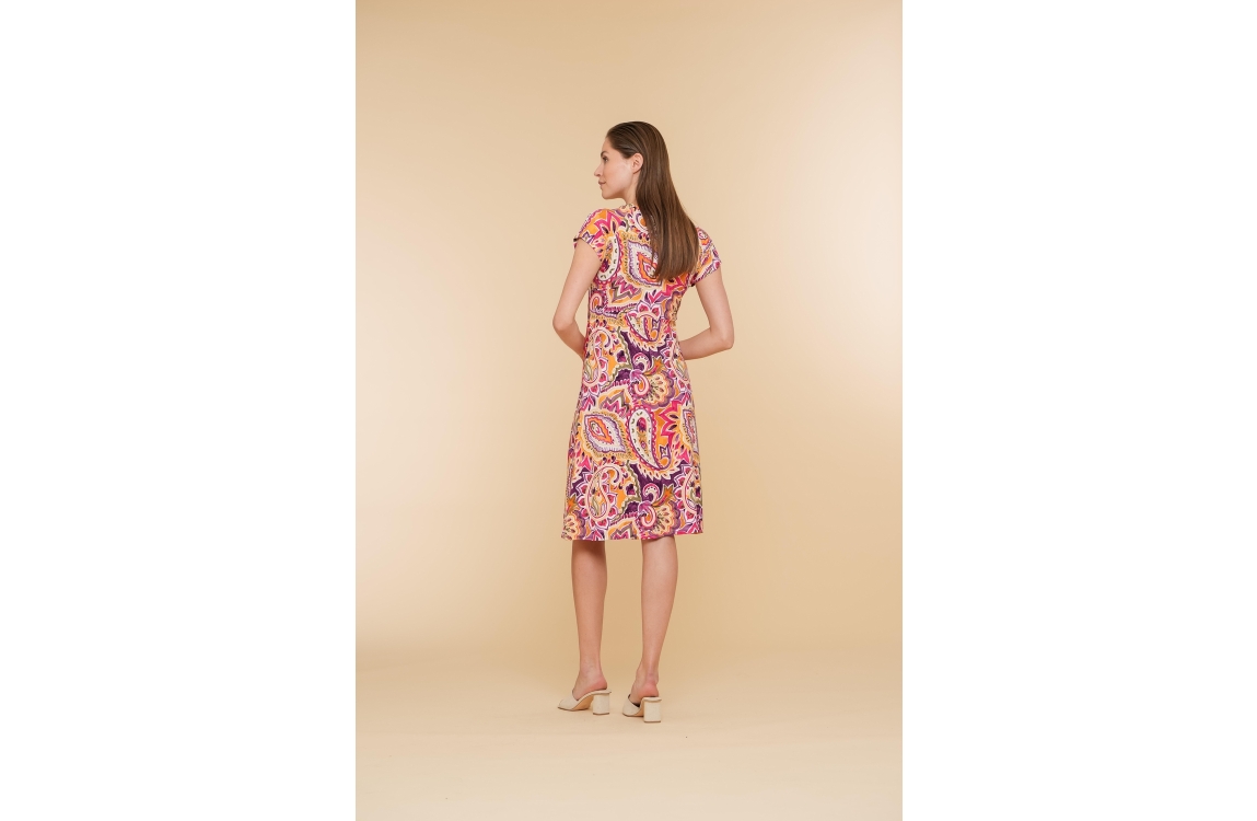 Geisha jurk 47410-60 JUNE. Dit rechtvallende model is voorzien van een V-hals en heeft korte mouwen. Deze paarse jurk van Geisha is bewerkt met een paisleyprint.