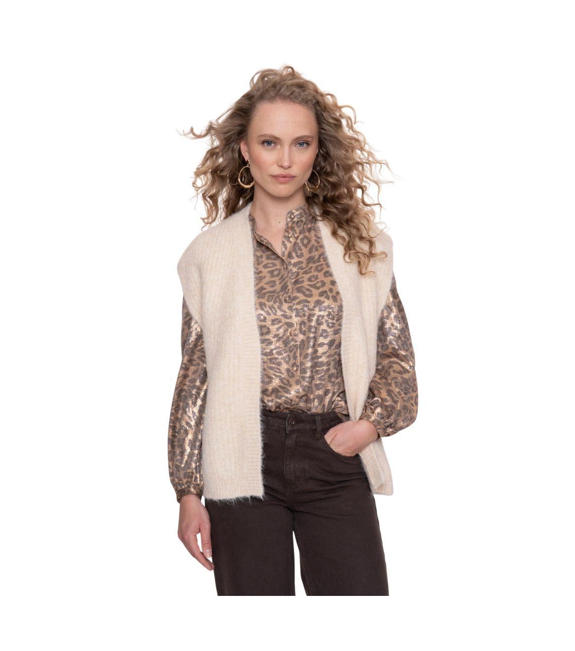 Geisha gilet hairy 54830-29. Dit rechtvallend model is voorzien van een ronde hals en heeft korte kapmouwen. Deze beige gilet is openvallend.