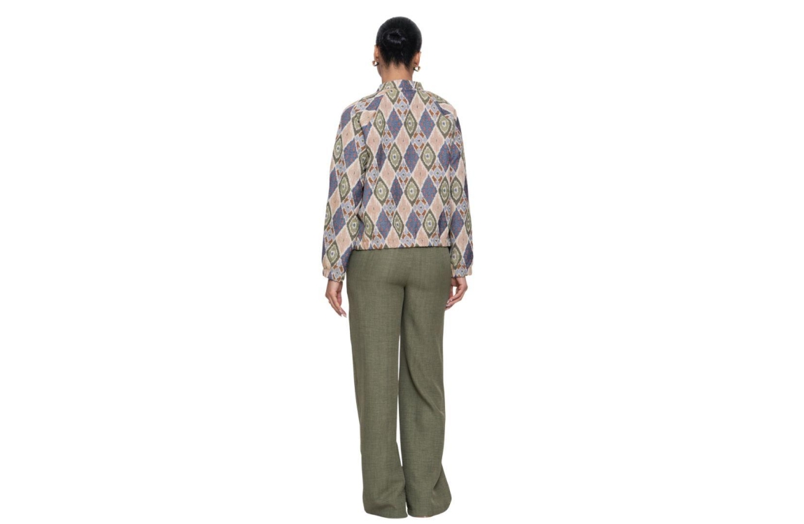 Geisha jasje 65106-20 560. Dit bomber model heeft een lage opstaande kraag en lange mouwen. Het olijfgroenige jasje sluit aan de voorzijde door middel van knoopsluitingen en is voorzien van twee steekzakken. Het model is all-over bewerkt met een grafische print in verschillende kleuren en is afgewerkt met een elastische zoom.