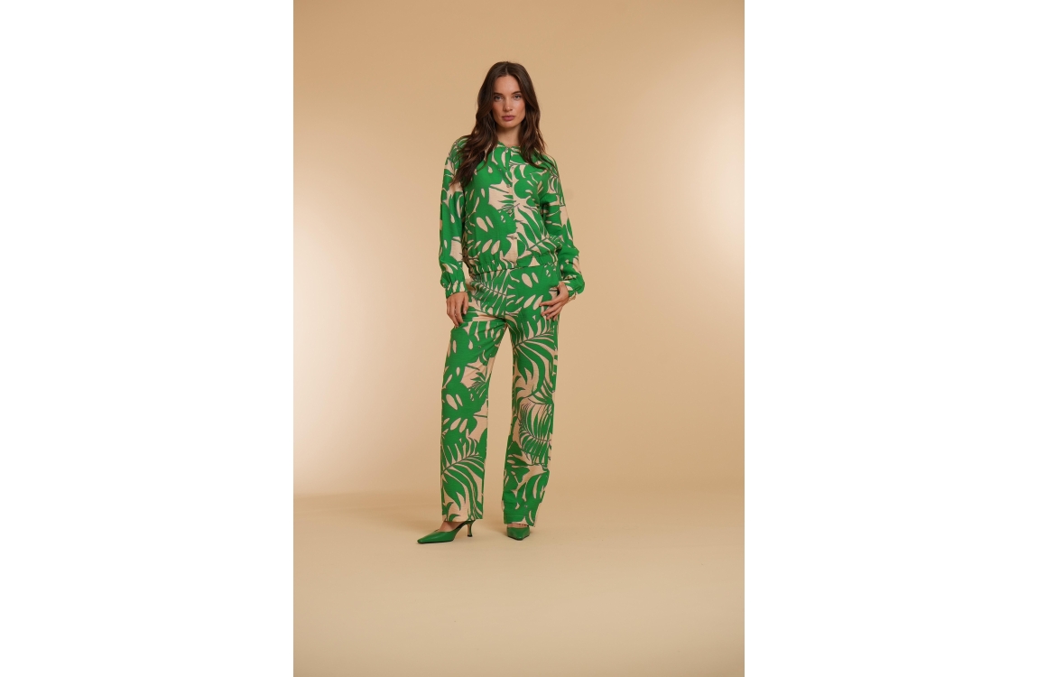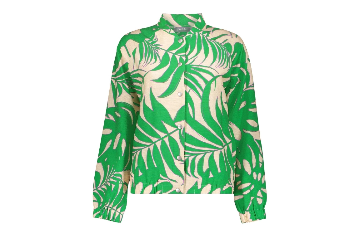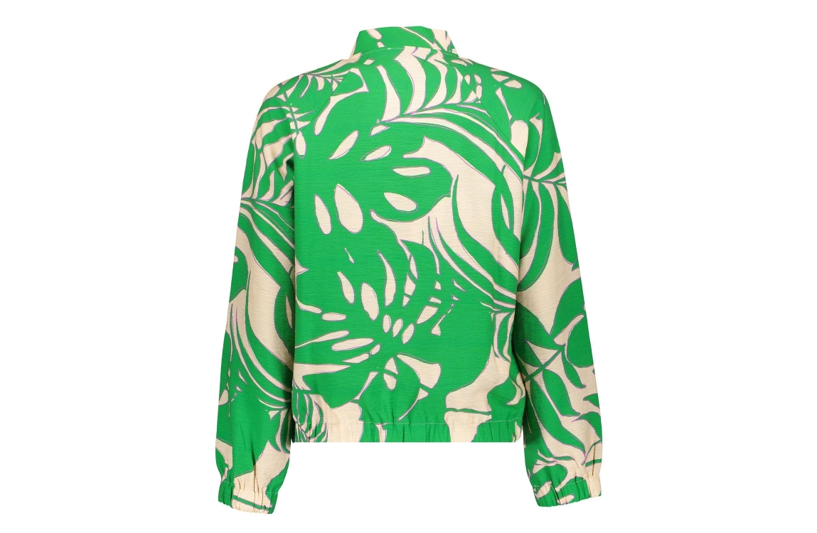 Geisha jasje 44072-20. Dit rechtvallend model is voorzien van een ronde hals en heeft lange mouwen. Deze groene jasje van Geisha sluit door middel van drukknopen en beschikt over twee steekzakken. Dit model is all-over bewerkt met een bladprint en is afgewerkt met elastische boorden.