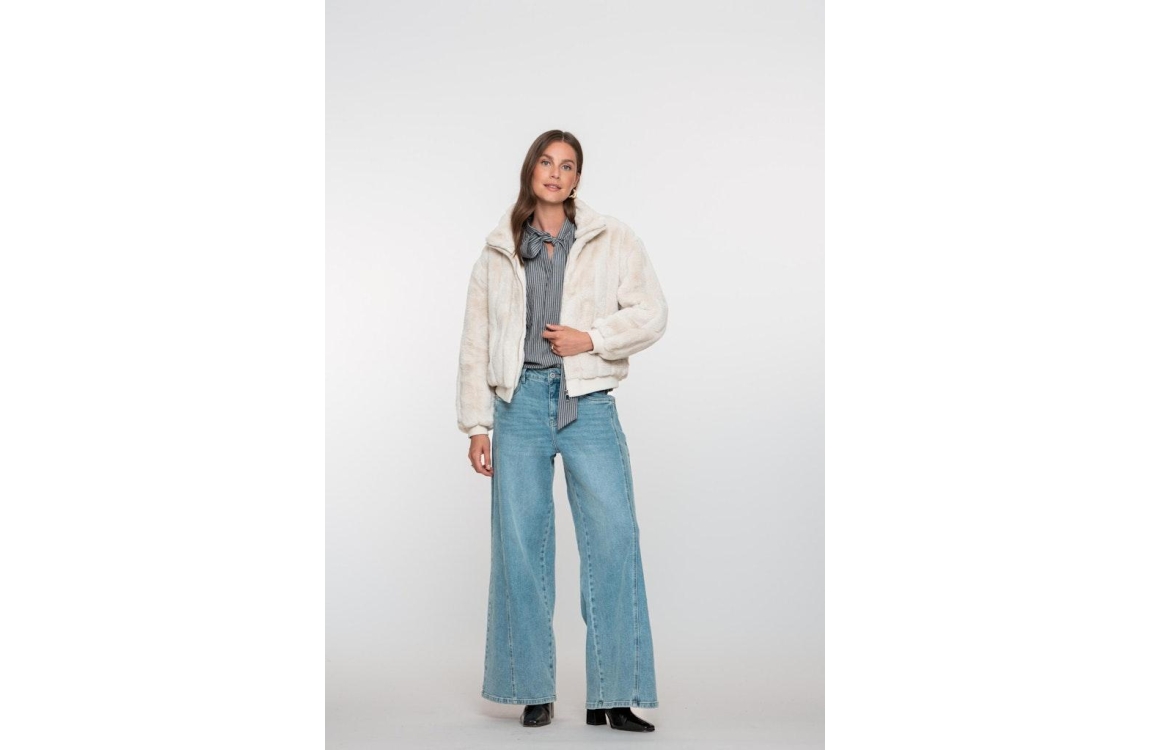 Geisha jas fake fur 58562-19. Dit oversized model heeft een ronde hals, lange mouwen en sluit door middel van een rits. Deze beige kleurige jas van Geisha is uitgevoerd in een faux fur materiaal en beschikt over schuine steekzakken op het voorpand. Deze zachte jas is afgewerkt met elastische boorden aan de onderzijde.