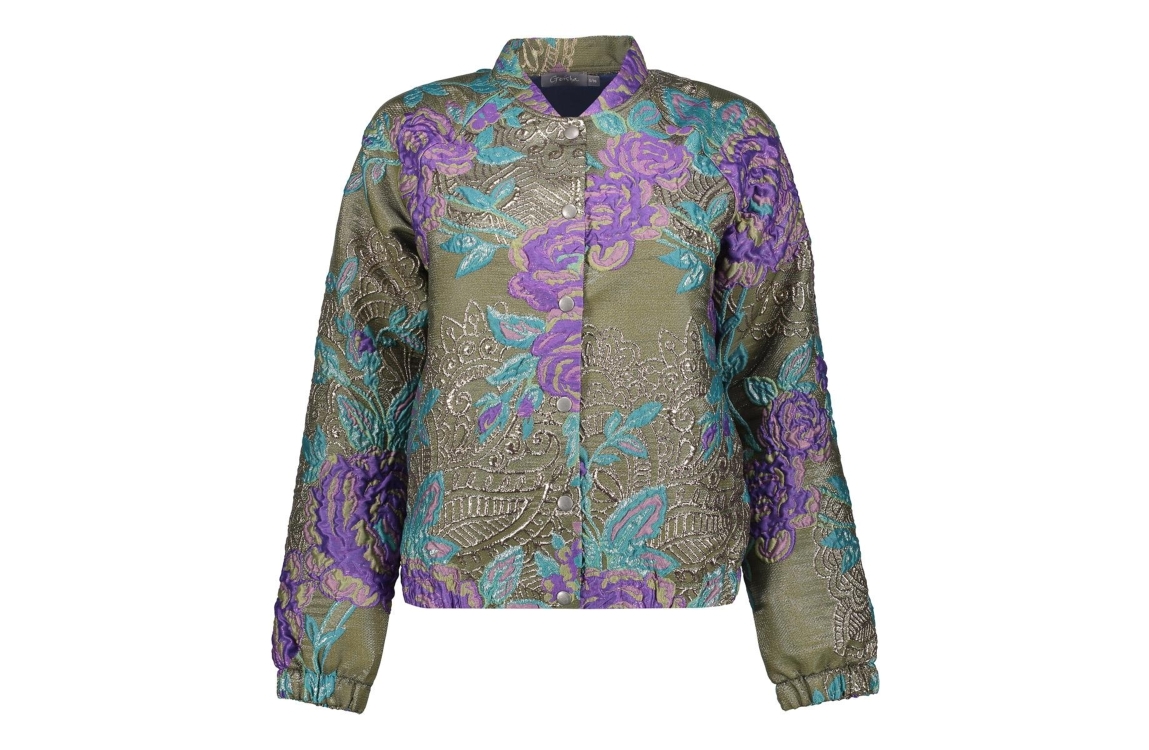 Geisha jasje 55713-20. Dit boxy model heeft een opstaande, ronde kraag en lange mouwen. Deze groene jas van Geisha is all-over bewerkt met een grafische print in verschillende kleuren en sluit aan de voorzijde door middel van knopen. Het model is afgewerkt met een elastische zoom en is voorzien van twee steekzakken.